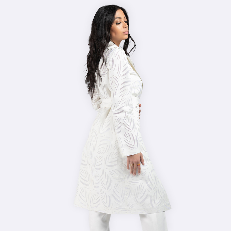 جاكيت طويل بتصميم فني راقٍ، يتميز بقصة انسيابية وياقة كلاسيكية عريضة مطوية، ومزين بنقوش مفرغة على شكل أوراق شجر دقيقة تغطي القطعة.