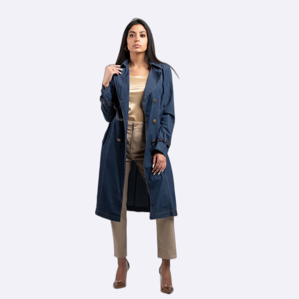 جاكيت طويل بأسلوب الترنش كوت الكلاسيكي، مصنوع من قماش الدينيم، يتميز بصفين من الأزرار الأمامية المزدوجة وياقة مطوية عريضة.