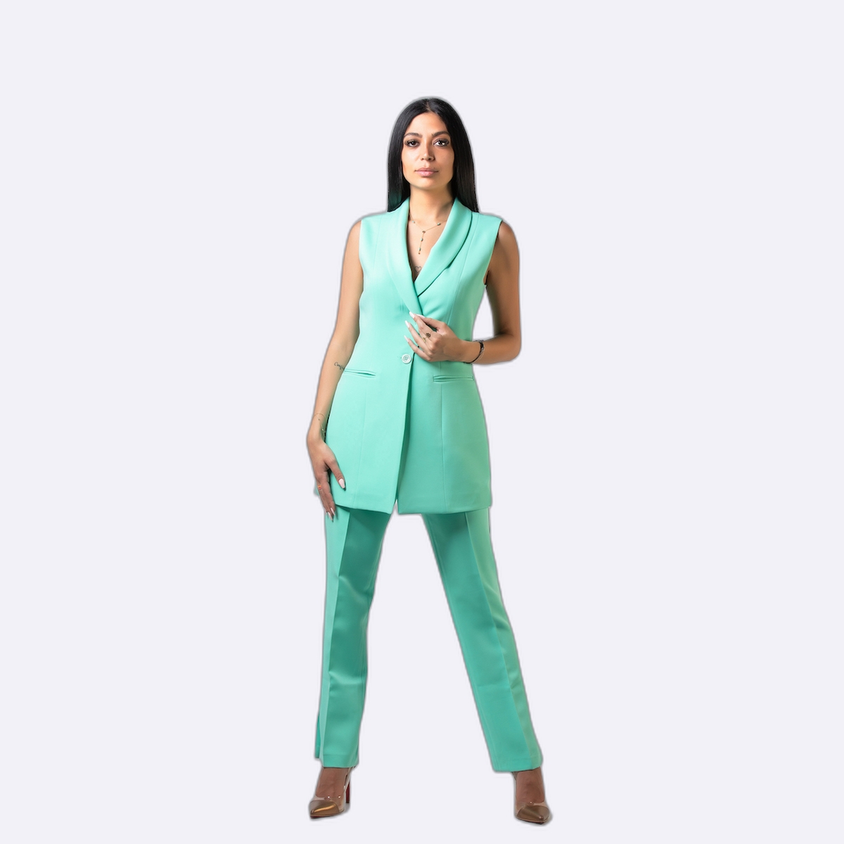 جاكيت بليزر بدون أكمام (فيست) بتصميم عصري وأنيق، يتميز بقصة ضيقة ومحددة للجسم وياقة كلاسيكية مطوية (شال) تمتد لطرف القطعة.