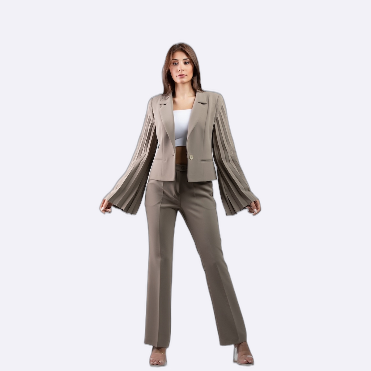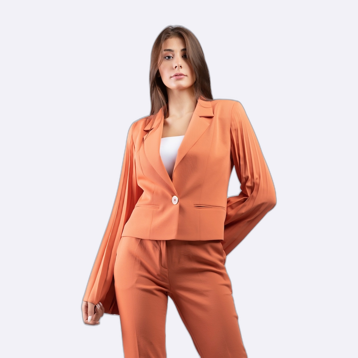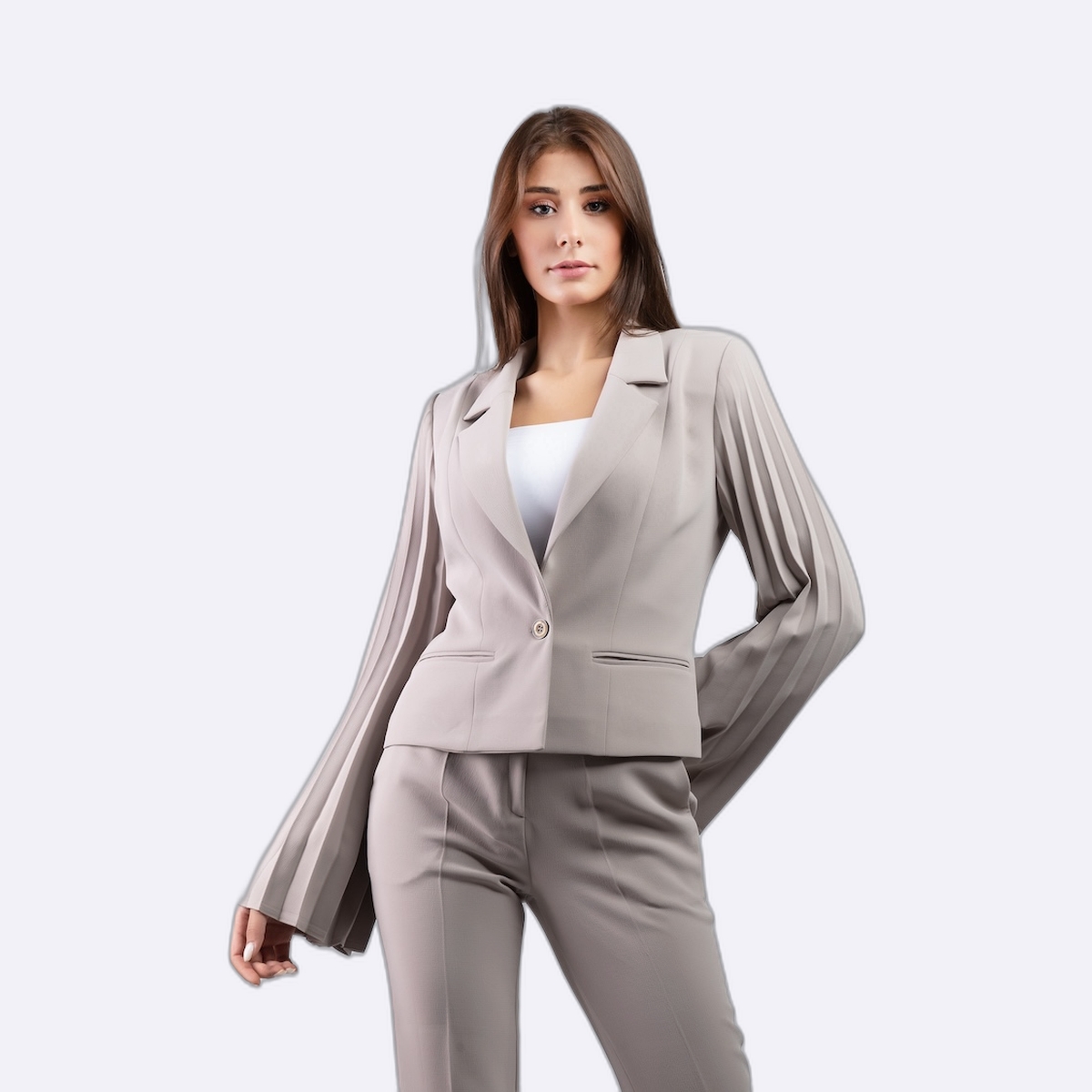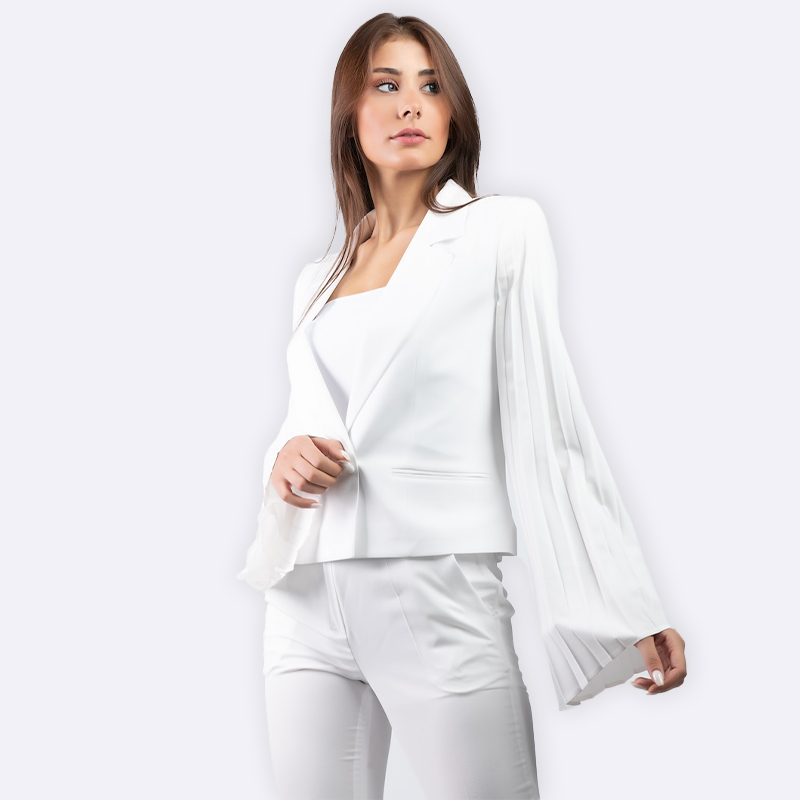 جاكيت بليزر قصير بتصميم عصري وفريد، يتميز بياقة كلاسيكية مطوية وزر واحد للإغلاق، وتتفرد القطعة بأكمام واسعة ومكسرة (بليسيه) تضفي لمسة جمالية.