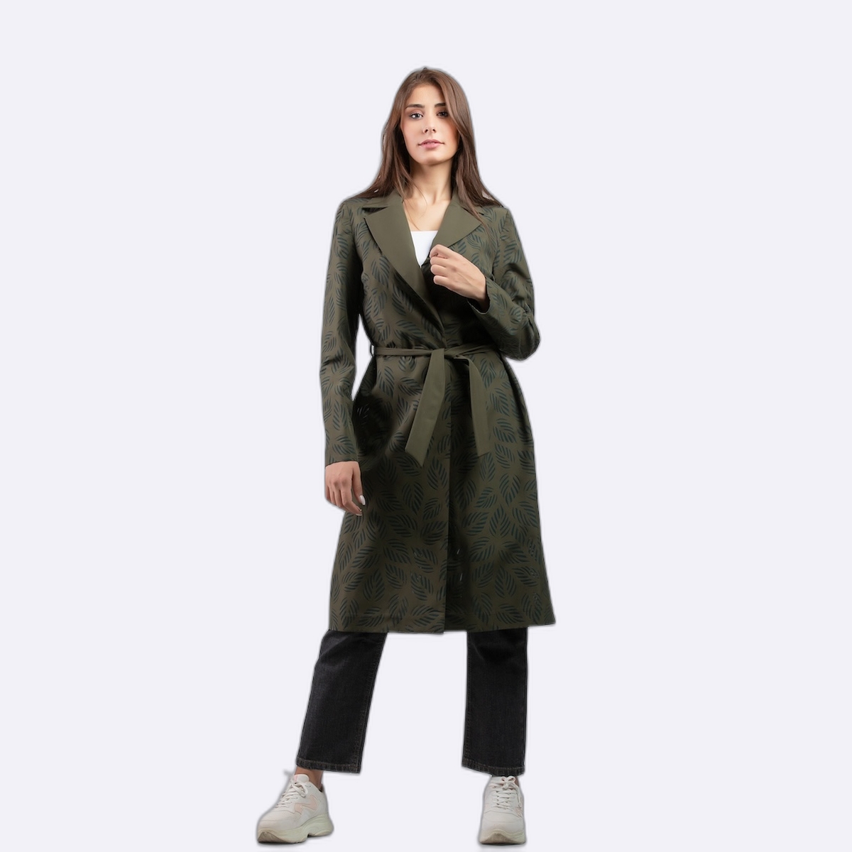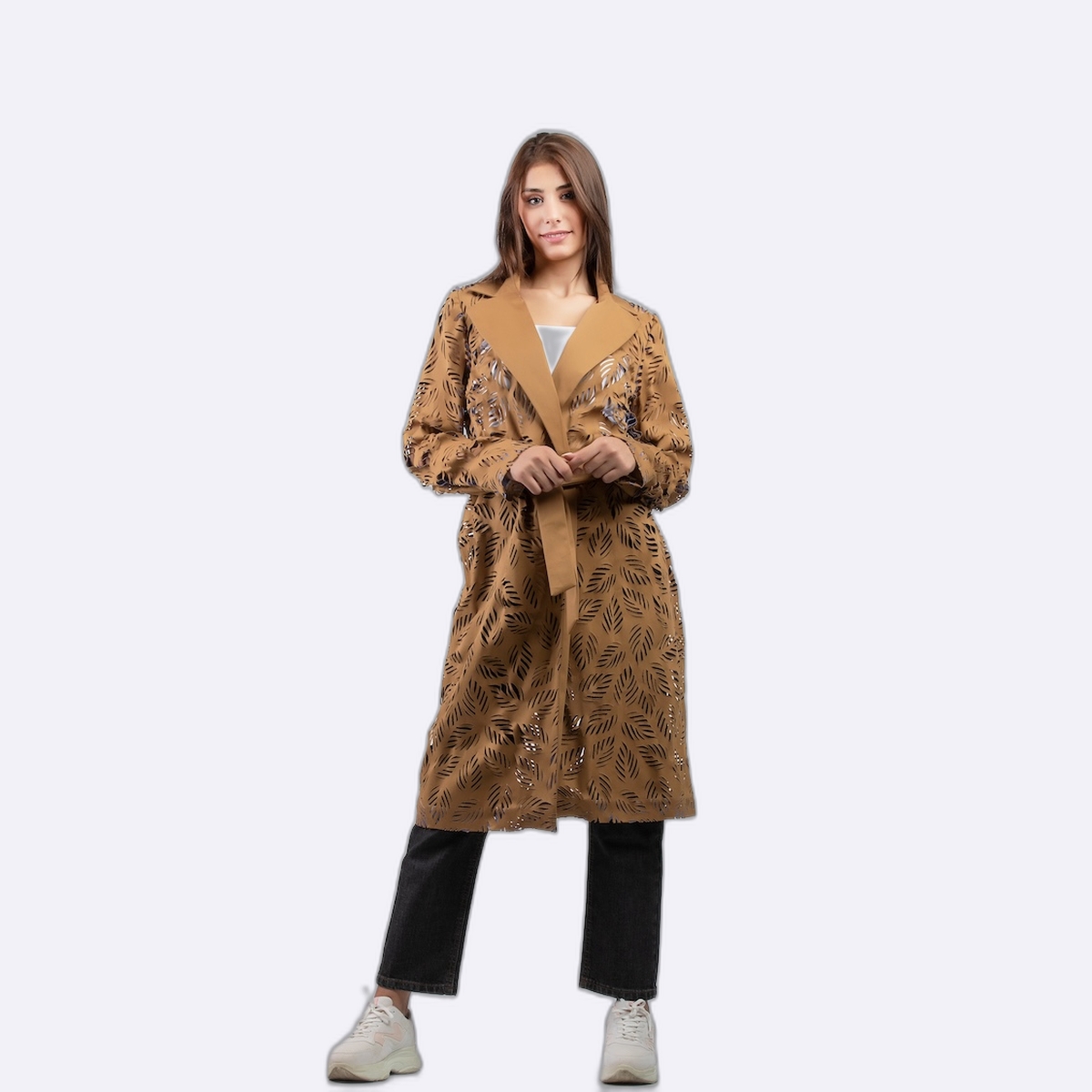 جاكيت طويل بأسلوب فني جذاب، يتميز بياقة كلاسيكية عريضة مطوية ومزين بنقوش هندسية دقيقة ومفرغة تغطي كامل القطعة.