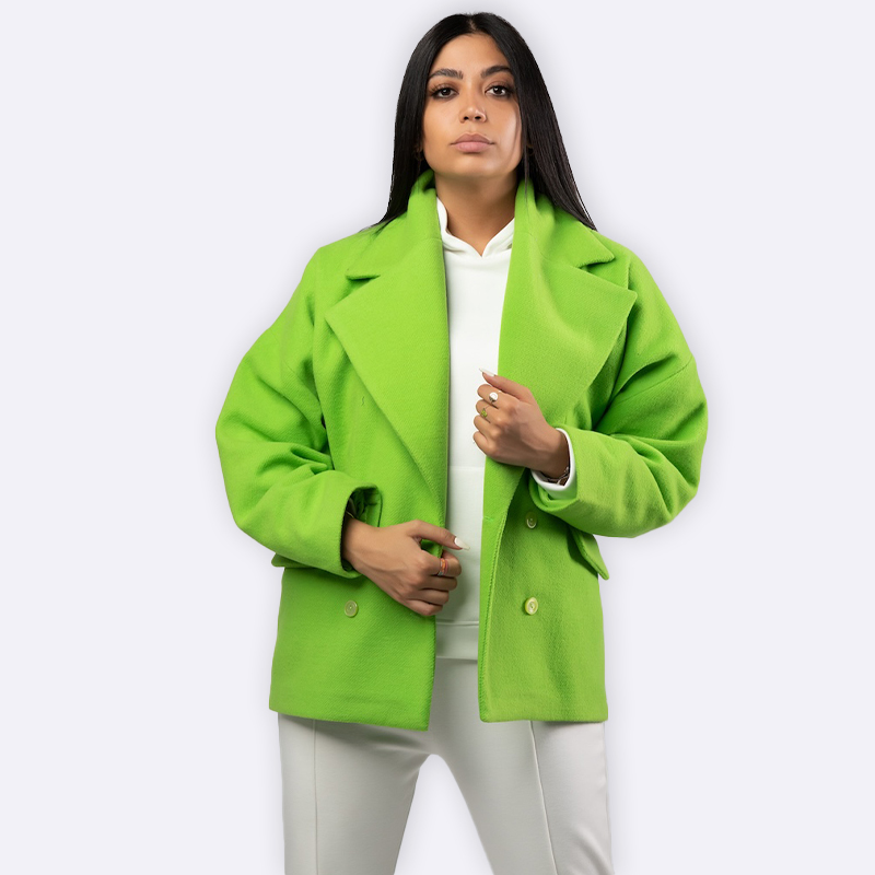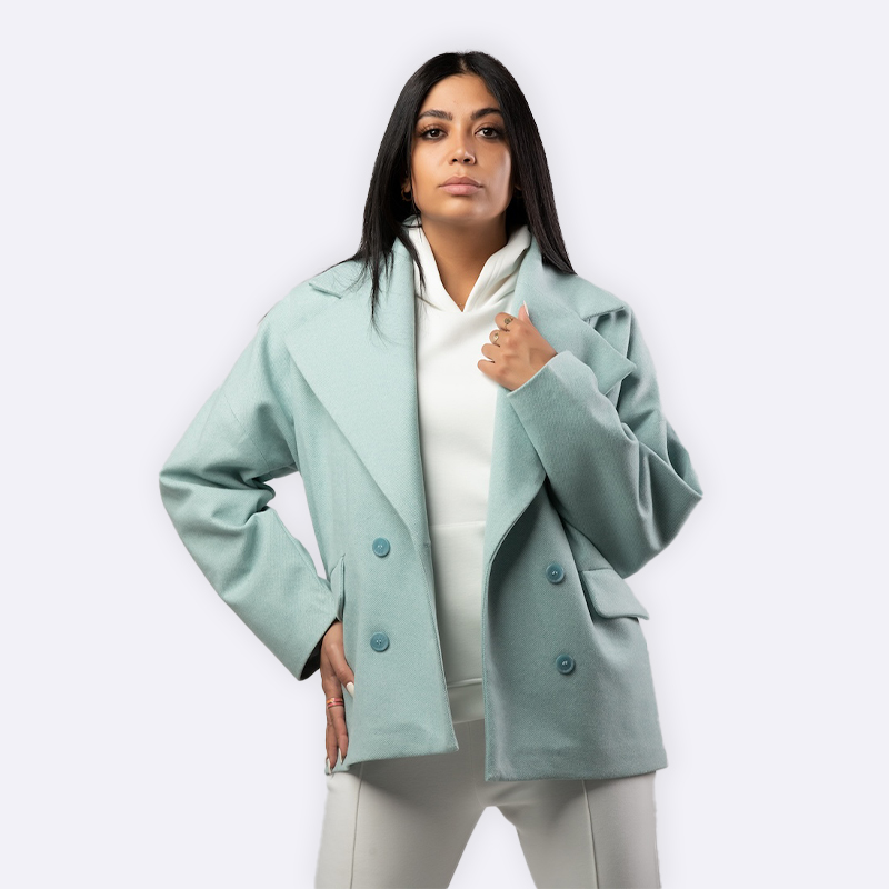 جاكيت رسمي بياقة عريضة مطوية وقصة محددة عند الخصر، يتضمن زر واحد للإغلاق وجيوب جانبية رفيعة مدمجة