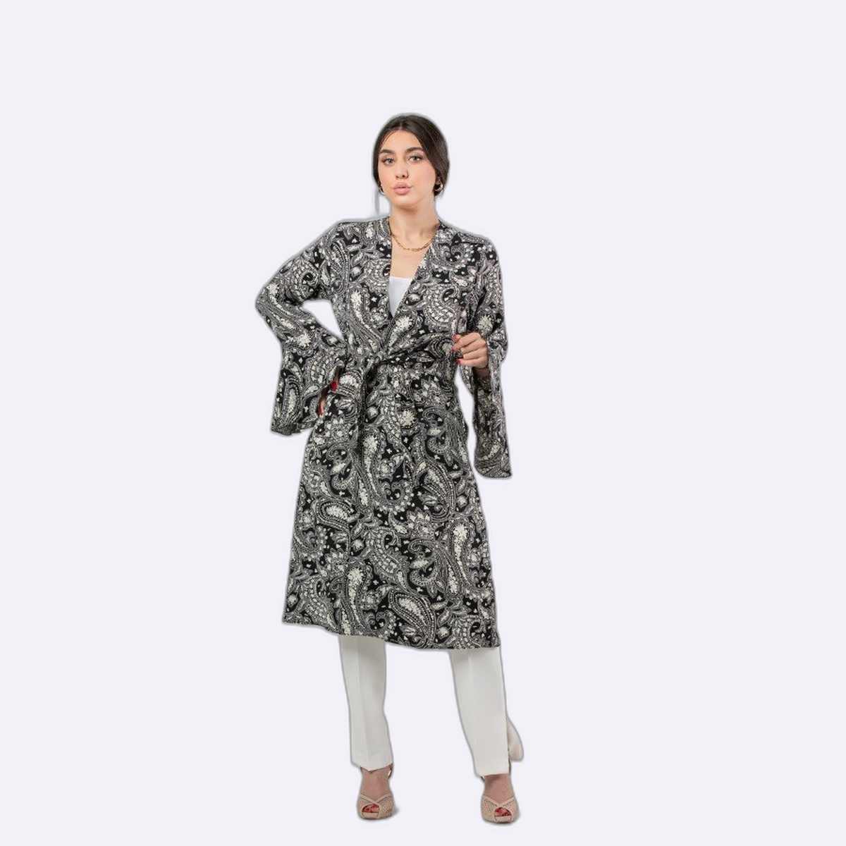جاكيت طويل مفتوح مزين بنقشات البايزلي المتداخلة وأكمام واسعة تضفي لمسة من الأناقة التقليدية العصرية