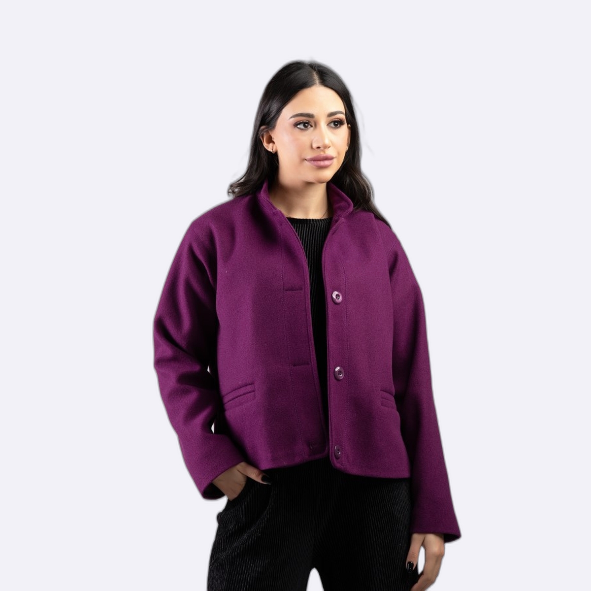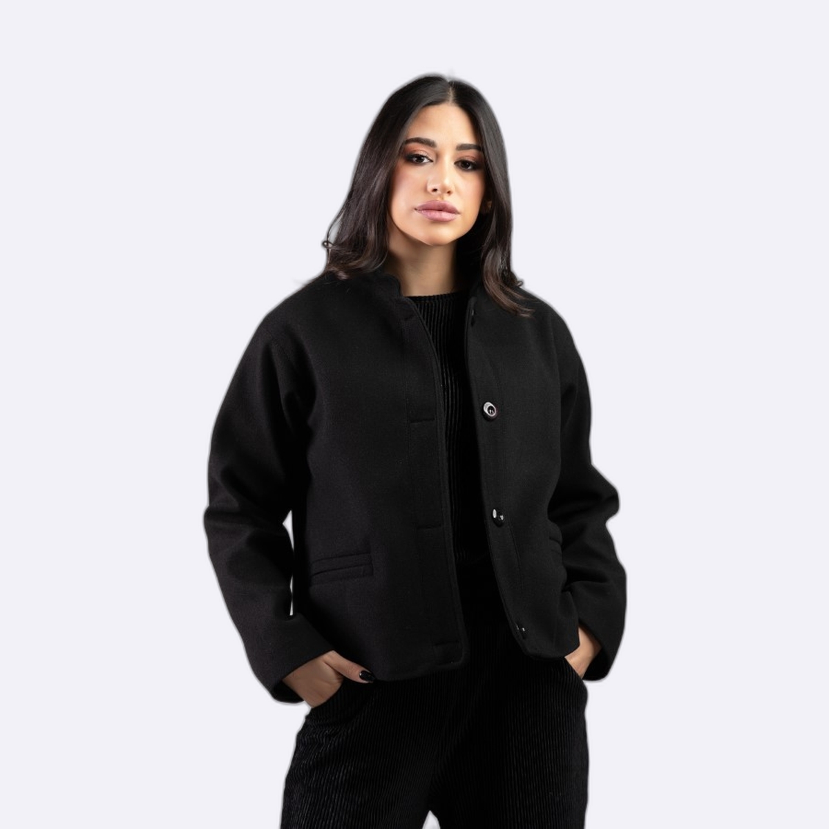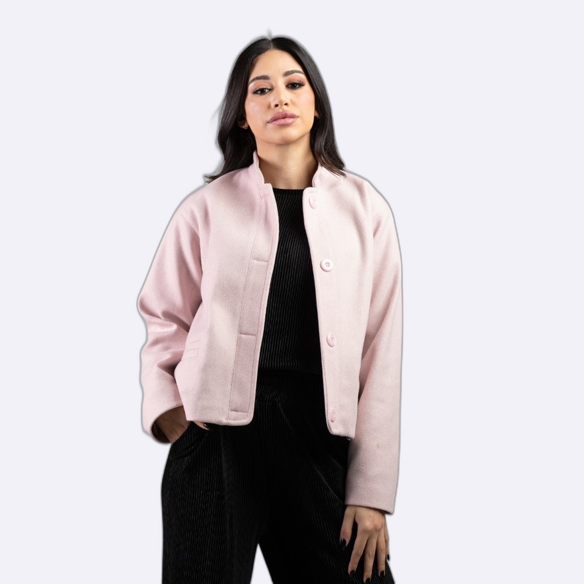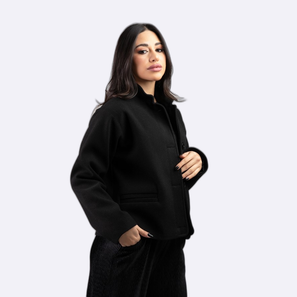 جاكيت بتصميم عصري وبسيط يتميز بياقة قصيرة وأزرار أمامية بارزة مع جيوب جانبية ناعمة ليوفر إطلالة أنيقة وعملية تناسب مختلف الأوقات.