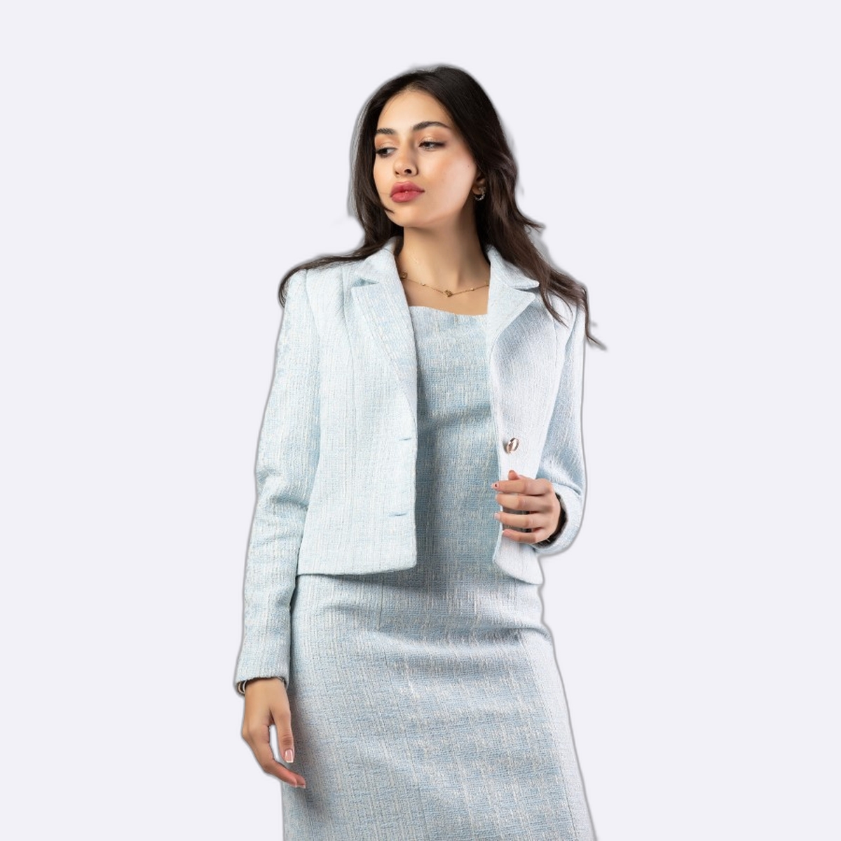 جاكيت بتصميم كلاسيكي من قماش التويد الفاخر يتميز بياقة رسمية وأزرار أمامية أنيقة وقصة قصيرة تمنح مظهراً راقياً وجذاباً.