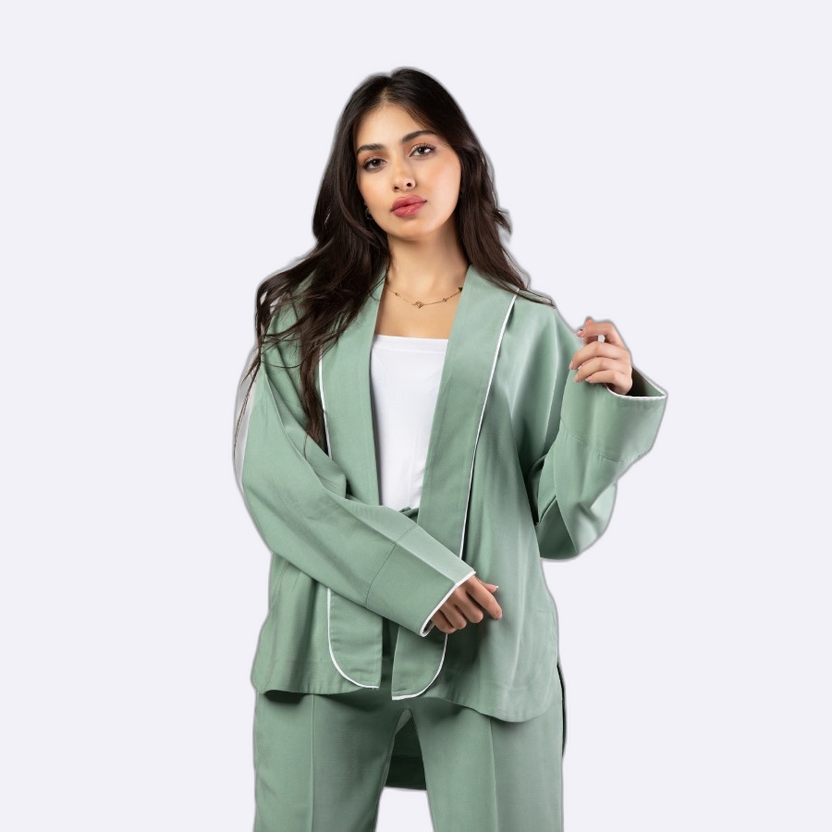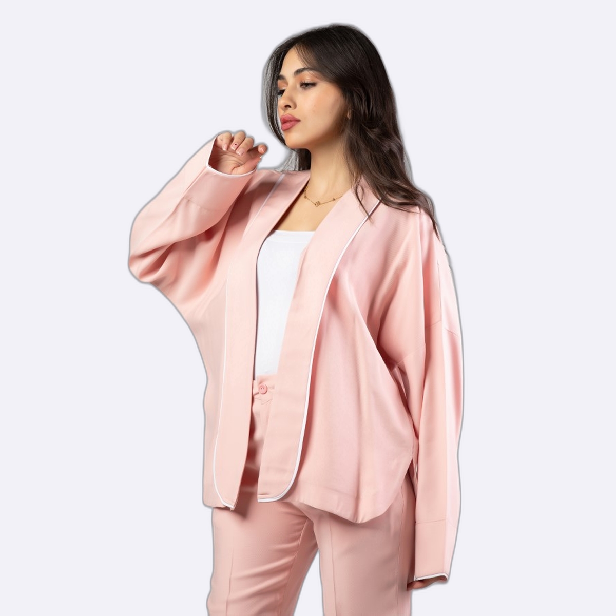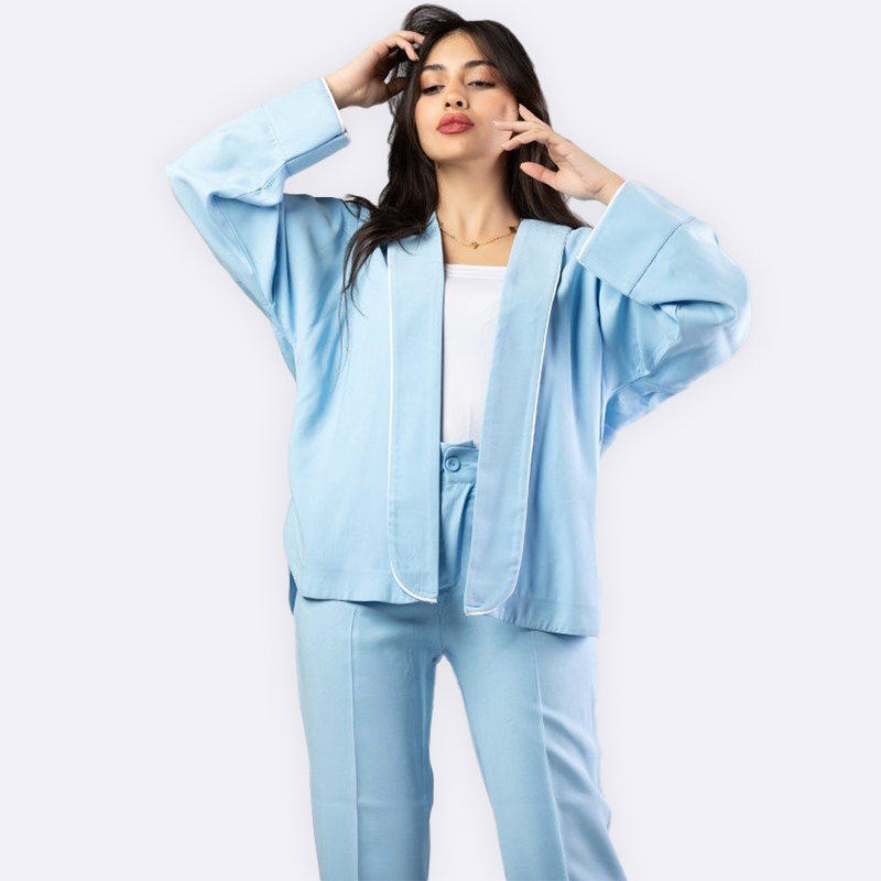 جاكيت عصري مريح بستايل الأوفر سايز، يتميز بلون أزرق سماوي هادئ وتصميم مفتوح وبسيط مع حواف بيضاء رفيعة تضيف لمسة أنيقة، مناسب للإطلالات اليومية الكاجوال.