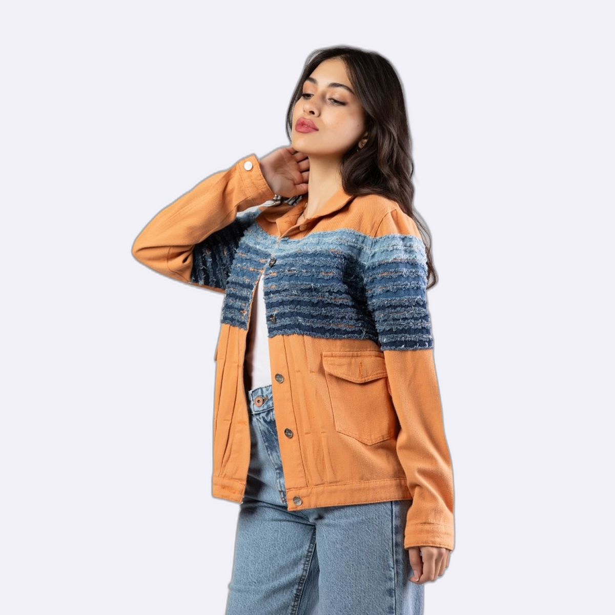 جاكيت جينز بتصميم عصري يجمع بين اللونين الأبيض والأزرق بأسلوب متدرج، يتميز بتفاصيل الشراشيب الناعمة على الصدر وأزرار أمامية لإطلالة كاجوال لافتة.