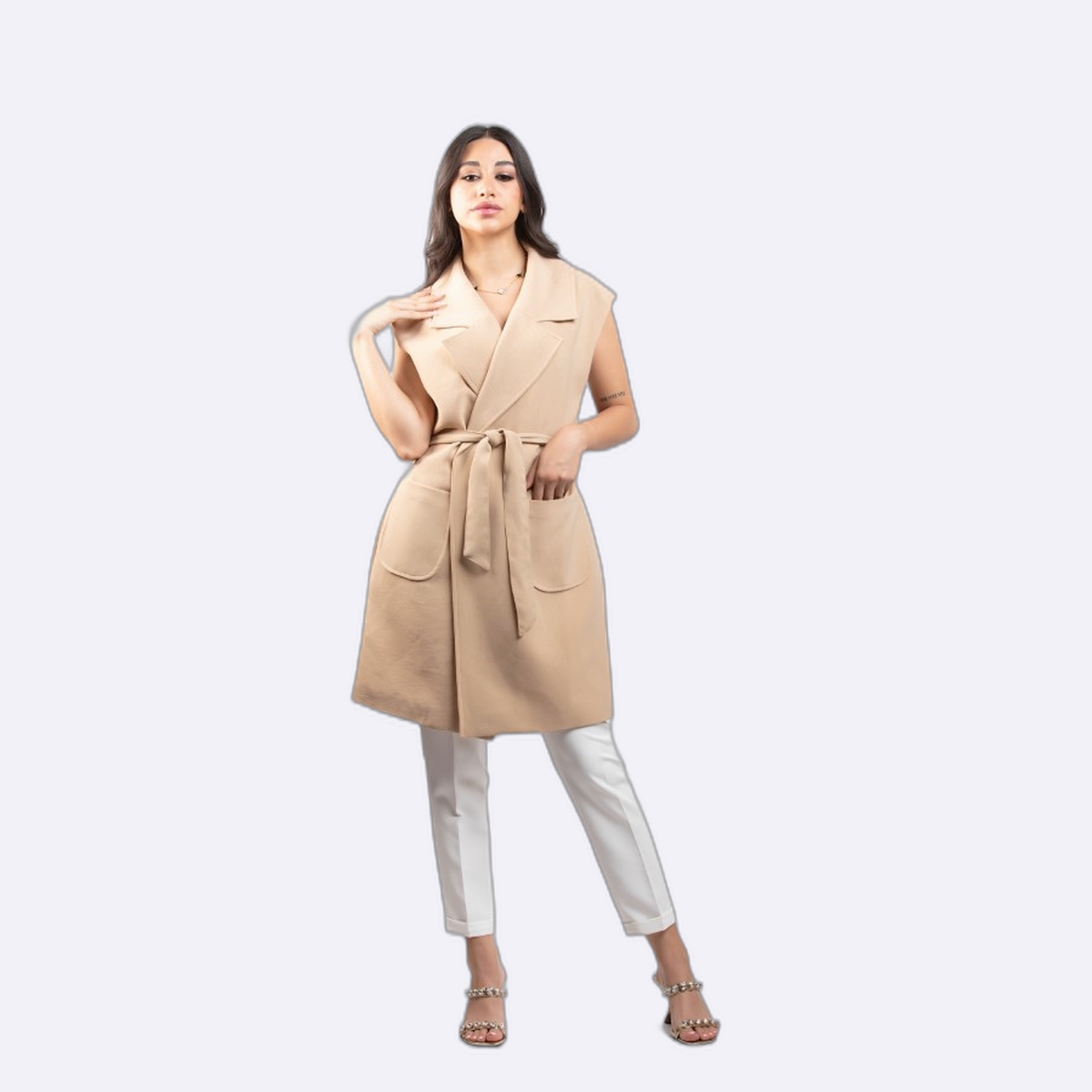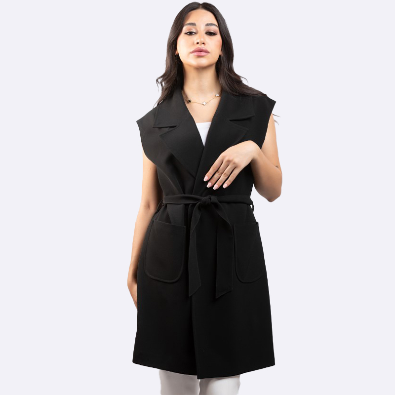 فيست طويل بدون أكمام يتميز بياقة عريضة وحزام خصر قابل للربط مع جيوب أمامية واسعة