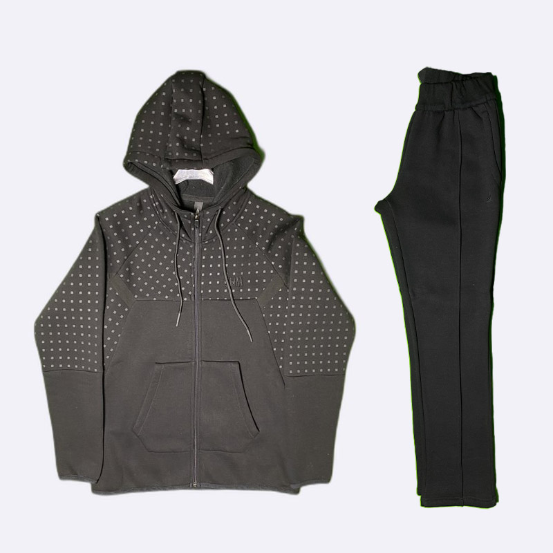 طقم رياضي رجالي عملي يتكوّن من كنزة هودي بسحاب مع قبعة وبنطال مريح بقصّة عصرية. مصنوع من خامة مريحة تناسب الحركة والاستخدام اليومي