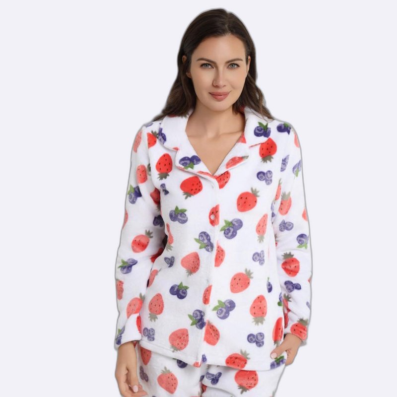استمتعي بأحلام سعيدة مع طقم البيجامة والروب المريح بنقشة التوت اللطيفة. مصنوع من أجود الخامات لتوفير أقصى درجات الراحة والاسترخاء.