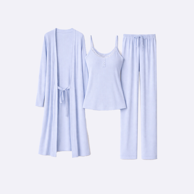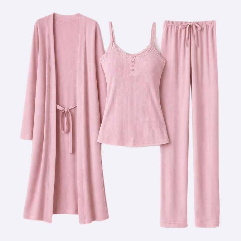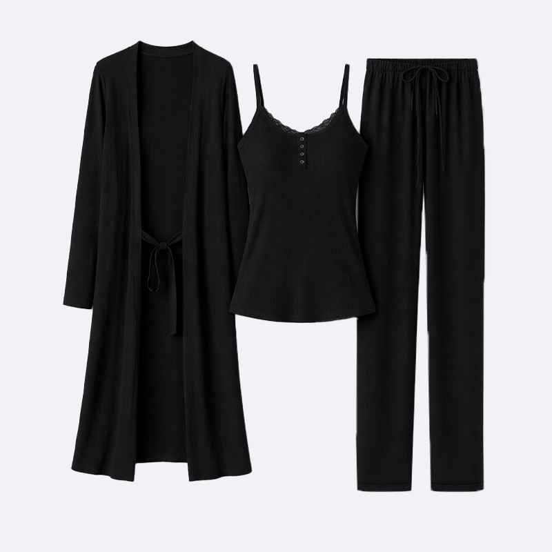 استمتعي بأمسيات مريحة مع هذا الطقم النسائي المكون من ثلاث قطع. يتضمن كارديجان أنيق، وقميص كامي مريح، وبنطلون مريح، مما يجعله الخيار الأمثل للاسترخاء في المنزل.