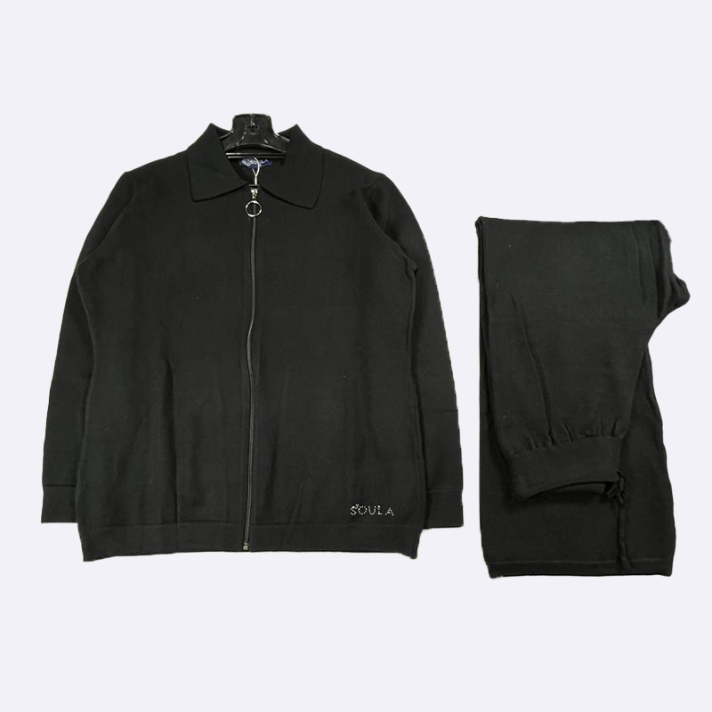 استمتعي بأقصى درجات الراحة والأناقة مع طقم الاستراحة النسائي المحبوك من سولا. يتميز هذا الطقم بجاكيت أنيق بياقة وبنطلون مريح برباط، مما يجعله مثالياً للاسترخاء في المنزل أو الخروج في نزهة غير رسمية.