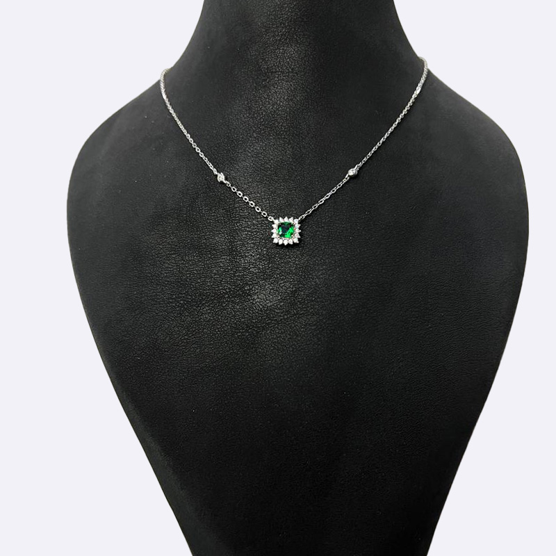 أضيفي لمسة من الأناقة إلى إطلالتك مع هذا العقد الفضي الرائع بزمردة خضراء متألقة. تصميم فريد يضفي عليكِ سحراً لا يقاوم.