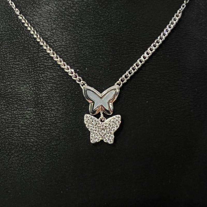 زيني عنقك بجمال الفراشات مع هذا العقد الفضي الأنيق. تصميم فريد يضفي لمسة من الرقة والجمال على إطلالتك.