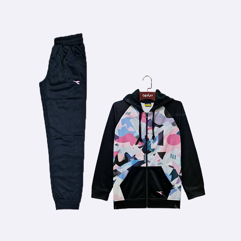 طقم رياضي للبنات مكون من قطعتين. جاكيت باللون الأسود مع أكمام وغطاء رأس، ويتميز بنمط مجرد من الألوان على الصدر والظهر (وردي، أزرق، أبيض، أسود)، بالإضافة إلى بنطال رياضي باللون الأسود