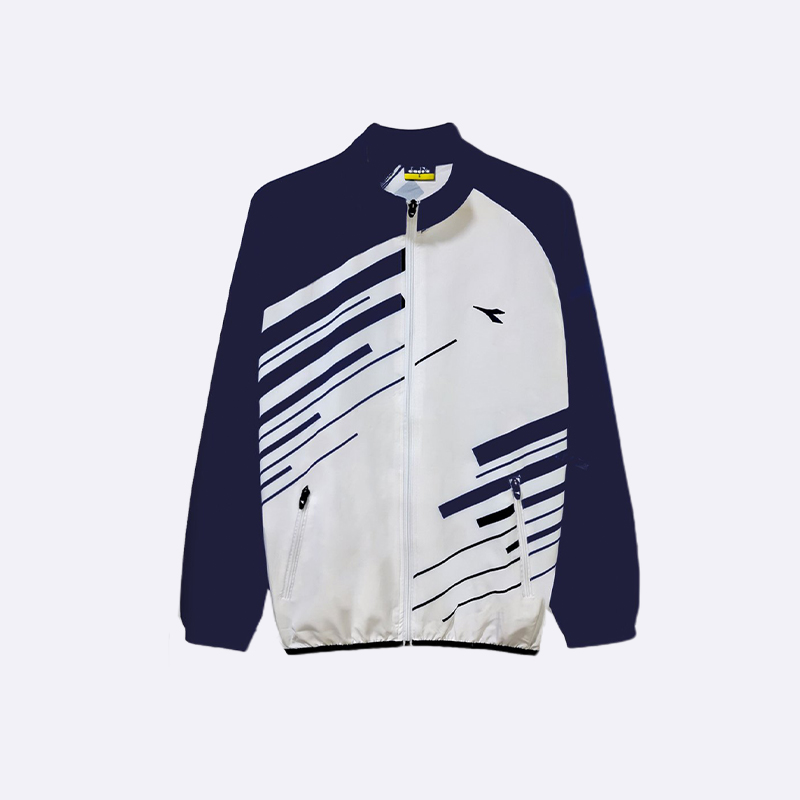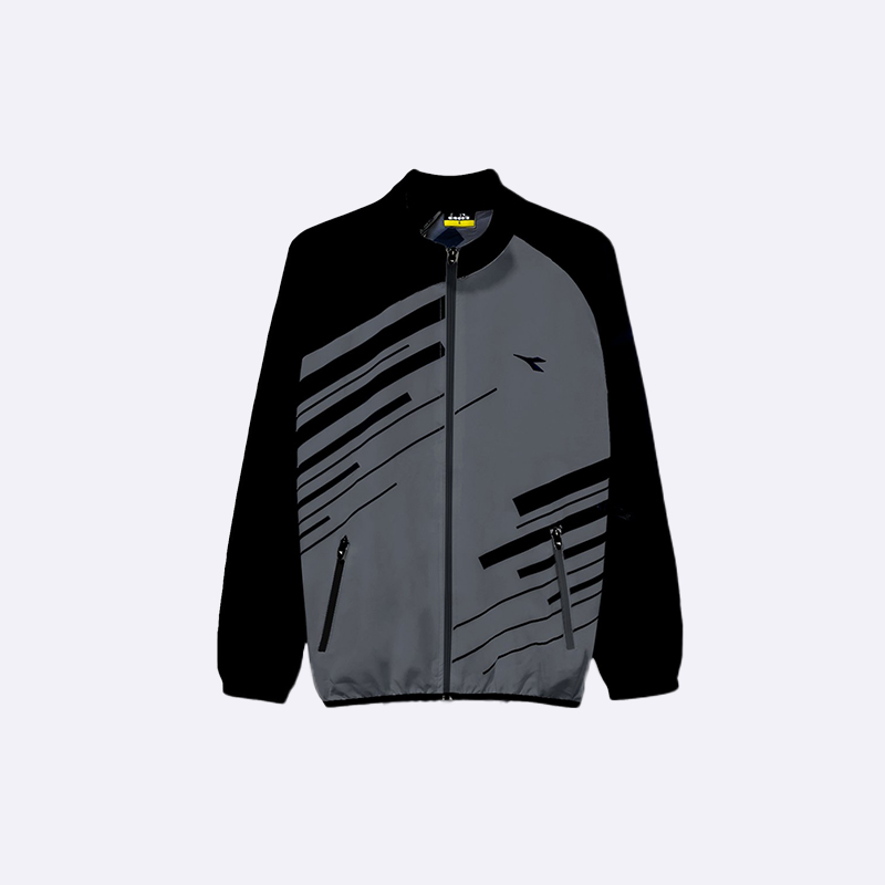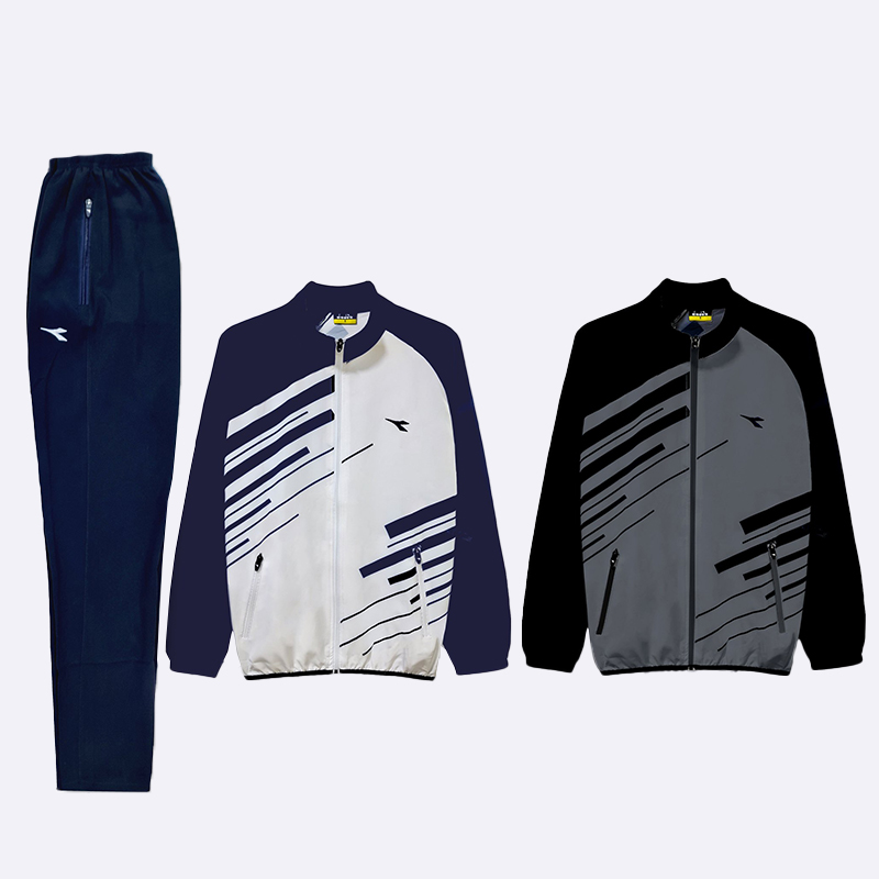 طقم رياضي رجالي يتكون من جاكيت بسحاب كامل وبنطال متناسق، مصمم بخطوط جرافيكية عصرية وشعار العلامة التجارية لضمان الراحة والأناقة أثناء التمارين.