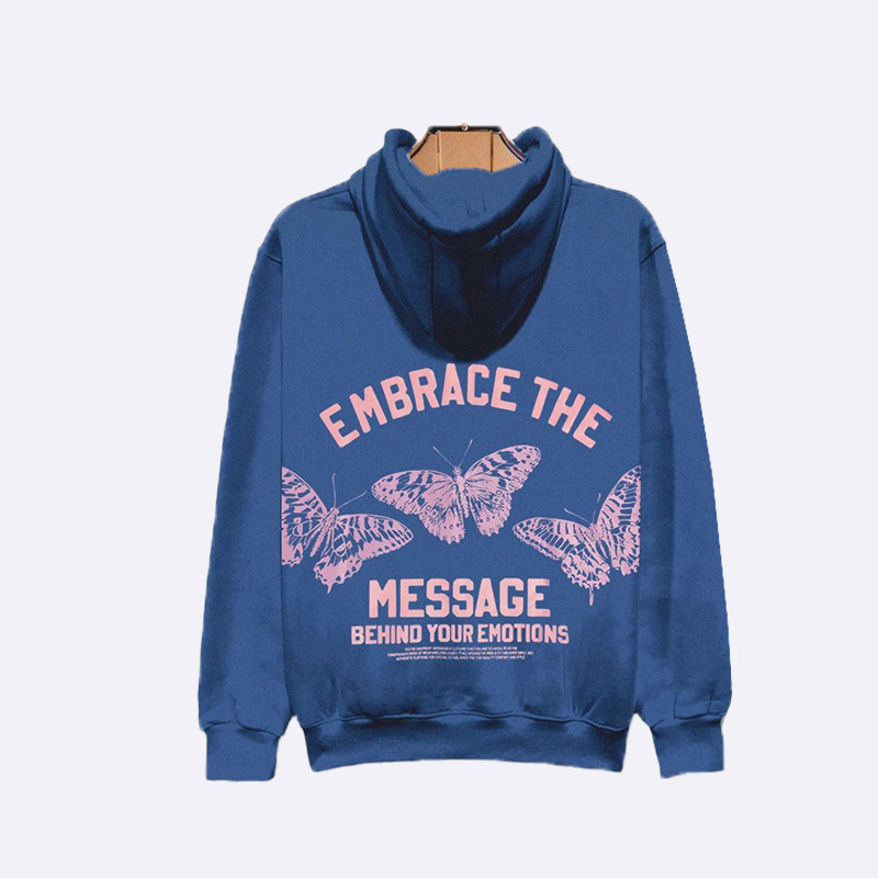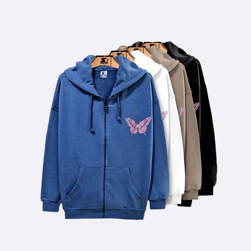 جاكيت هودي نسائي مريح بسحاب أمامي كامل وقبعة، مصنوع من قطن 100%. مزود بجيوب أمامية وطبعة فراشة صغيرة على الصدر. مثالي للارتداء اليومي والطبقات.