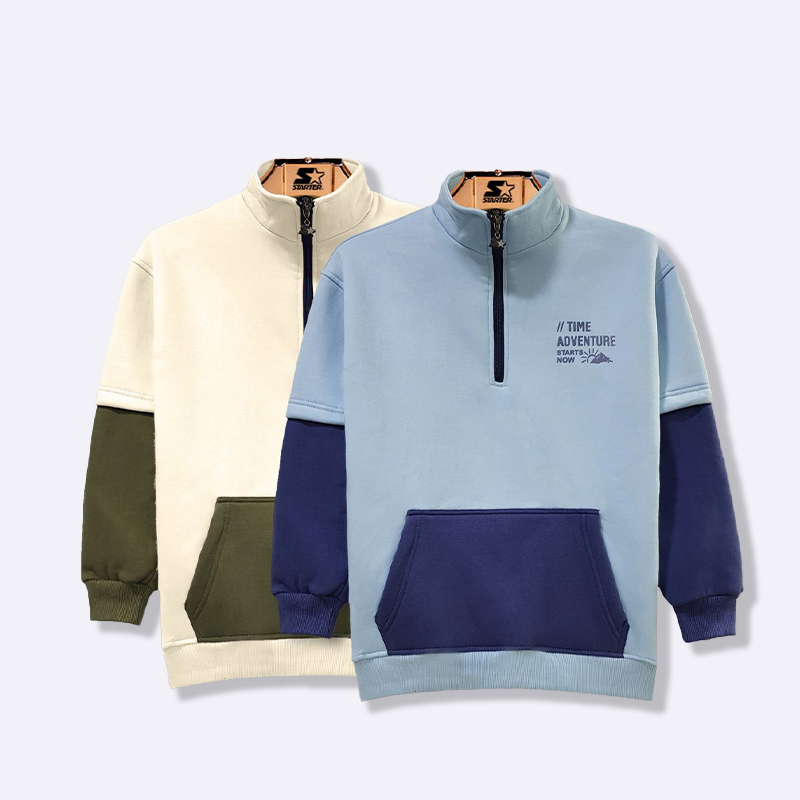 سويت شيرت أولادي/أطفال بقبة عالية وسحاب نصفي، يتميز بتصميم متباين الأكمام ومزود بجيب أمامي كبير. الخامة: مزيج 65% قطن و 35% بوليستر. مثالي للارتداء اليومي والمغامرات.