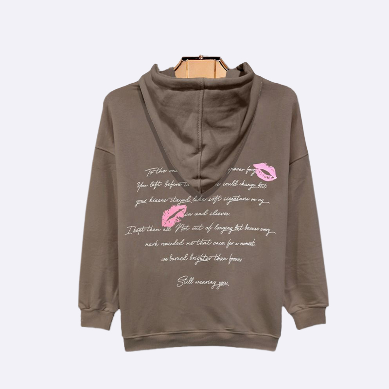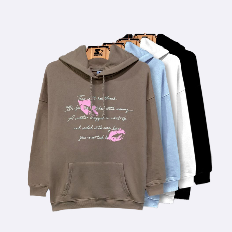 هودي مريح بغطاء رأس وجيب أمامي واسع مزين بطبعات نصية ورسومية من الأمام والخلف