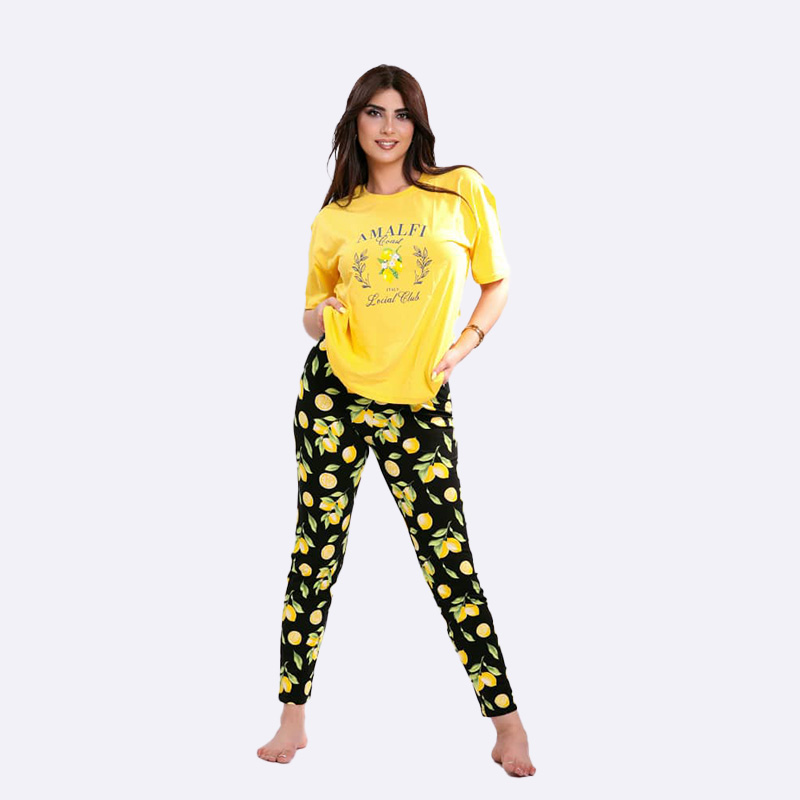طقم بيجاما نسائي منعش ومريح، يتميز بتي شيرت أصفر سادة يحمل عبارة "Amalfi Coast Lemon Club" مع رسمة ليمون، وبنطال طويل أسود مطبوع بنقشة الليمون الصفراء. مثالي للنوم أو للاسترخاء في المنزل بأناقة.