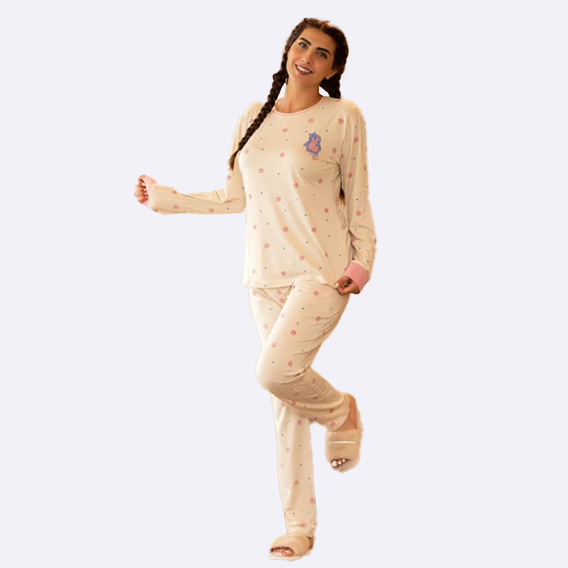 طقم بيجامة مريح مصنوع من قماش ناعم، يتميز بتصميم منقط بالكامل مع تطريز صغير على القميص، ومناسب للارتداء المنزلي.