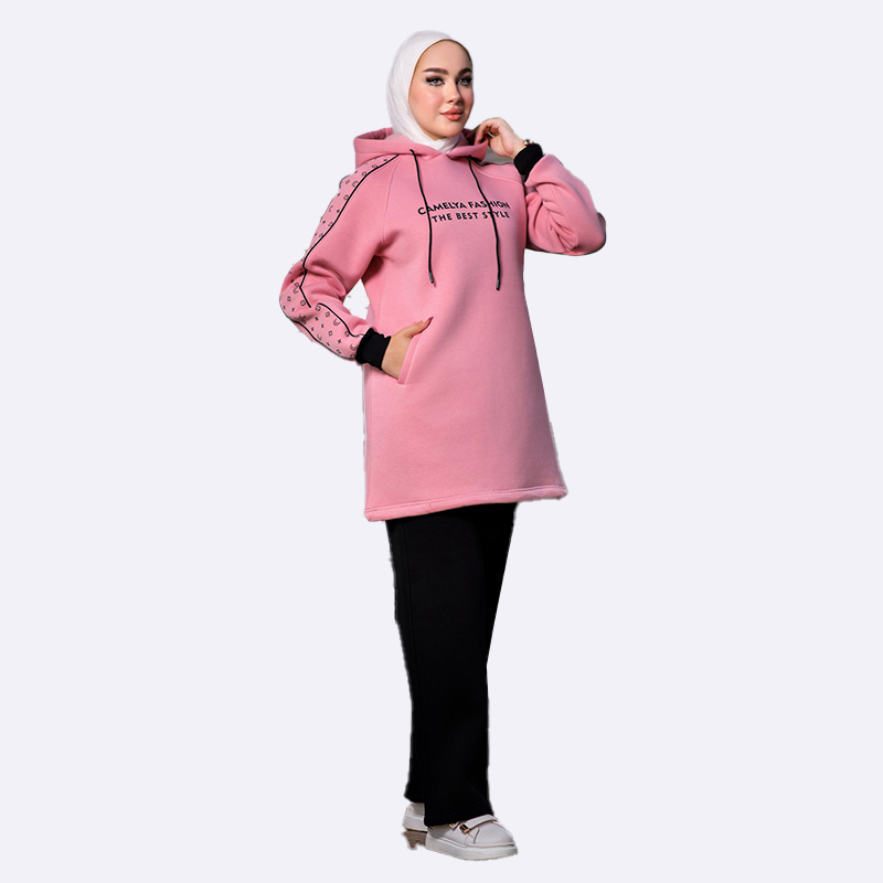 كنزة هودي رياضية طويلة (تونيك) من الفليس الدافئ، تتميز بغطاء للرأس وطباعة نصية على الصدر وطباعة زخرفية على طول الأكمام، مع جيب أمامي كبير.