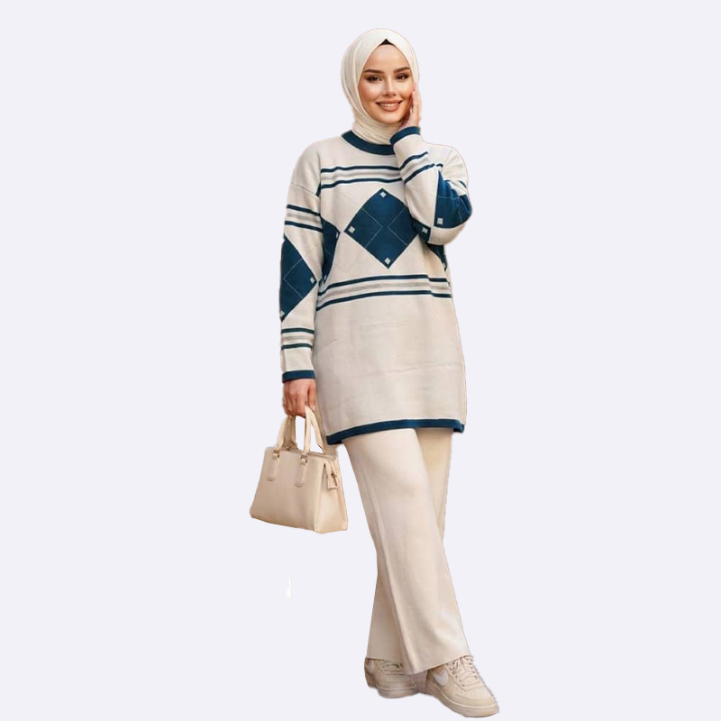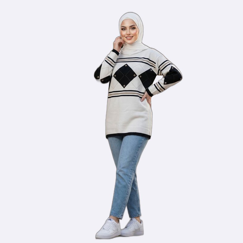 كنزة تريكو أنيقة تتميز برقبة مستديرة ونقوش هندسية كلاسيكية، توفر الدفء والمظهر العصري المحتشم.