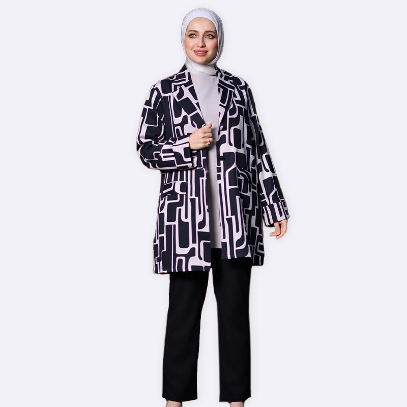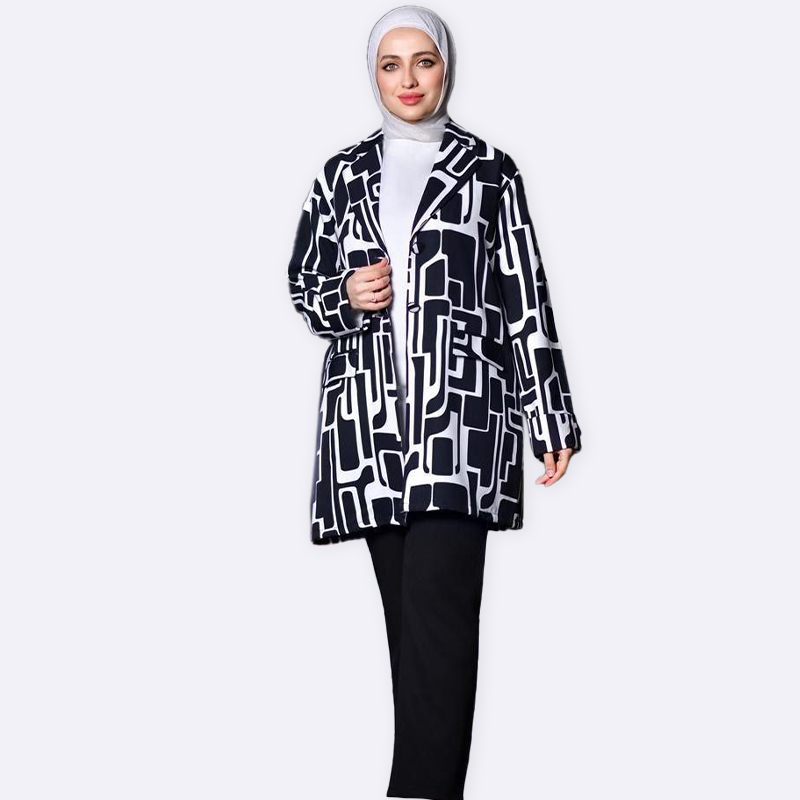تألقي بإطلالة عصرية مع هذا البليزر الطويل ذو الطبعة التجريدية الأنيقة. تصميم فريد يضفي لمسة مميزة على مظهرك.