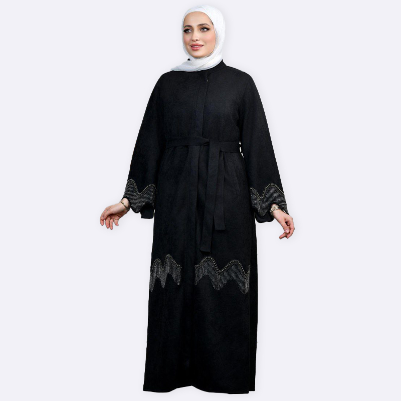 تألقي بأناقة مع هذه العباية السوداء الفاخرة والمزينة بتطريزات أنيقة. تصميم عصري ومريح مع حزام لتحديد الخصر، مثالية لإطلالة أنيقة ومحتشمة.