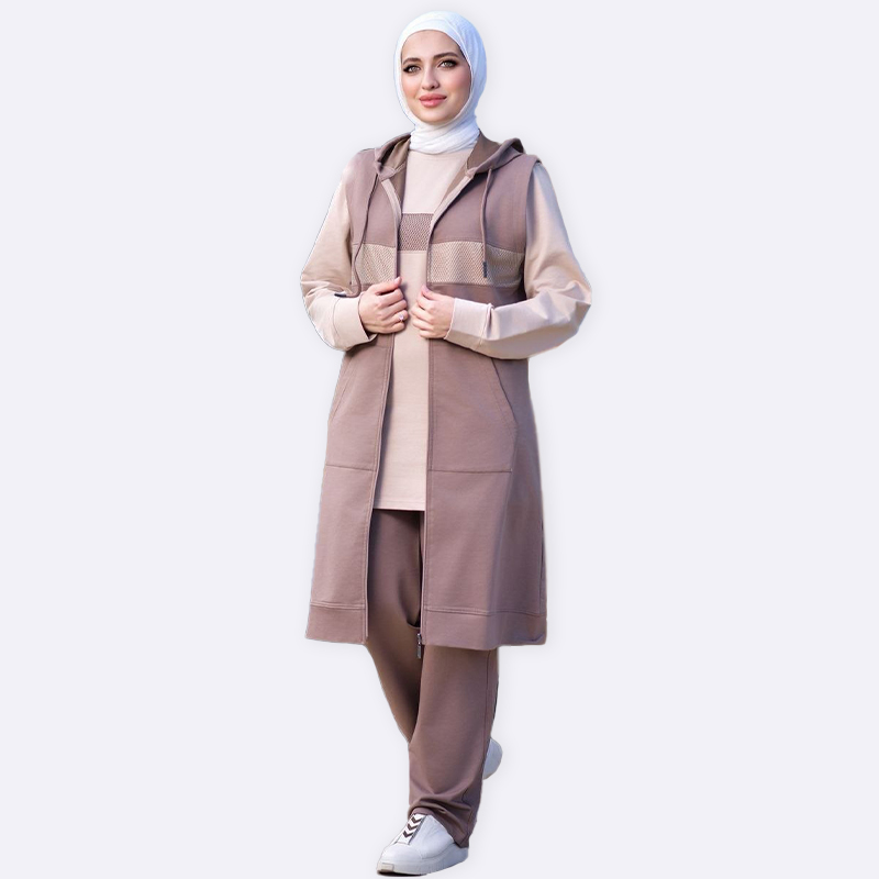 استمتعي بأناقة مريحة مع هذا الطقم المكون من ثلاث قطع. تصميم عصري ومحتشم يجمع بين الراحة والأناقة في كل تفصيلة.