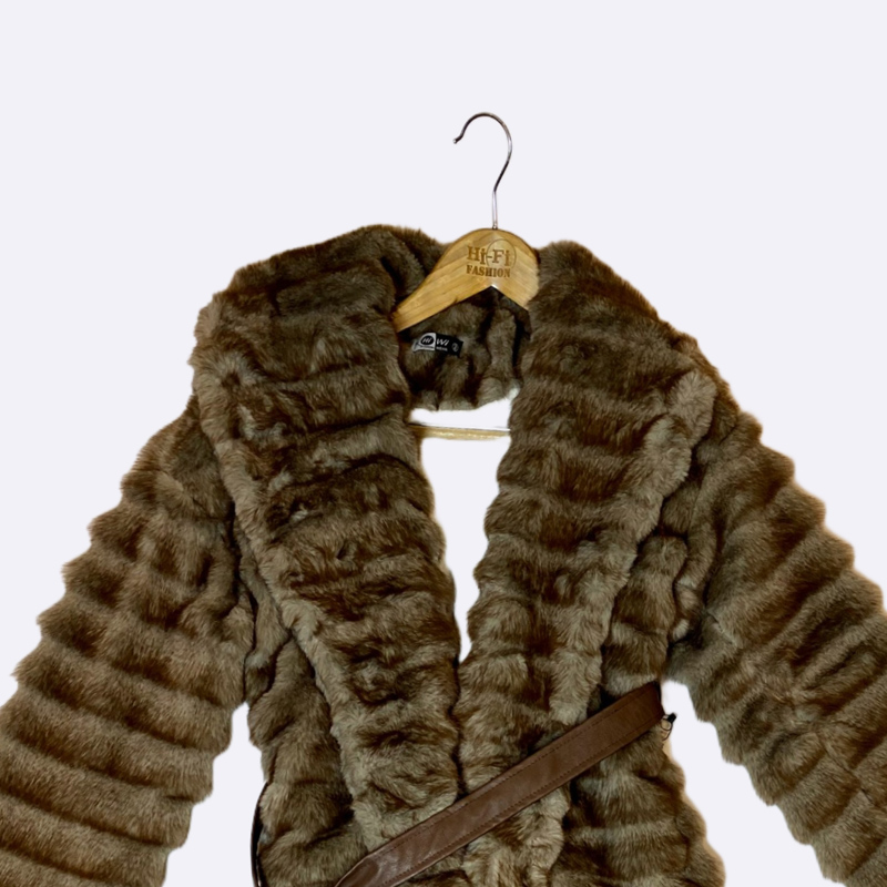 معطف نسائي شتوي طويل ودافئ من الفرو الصناعي البني المخطط أفقيًا، بياقة عريضة وحزام من الجلد الصناعي للخصر