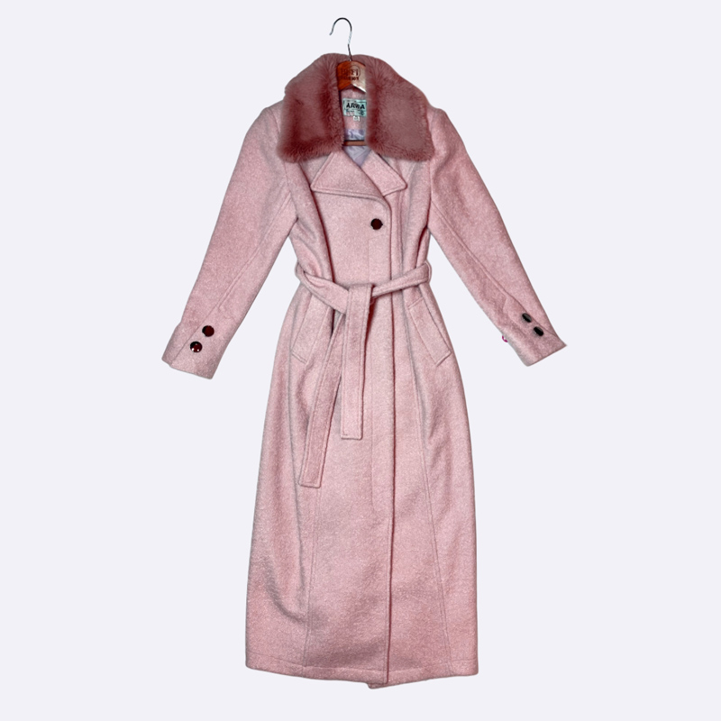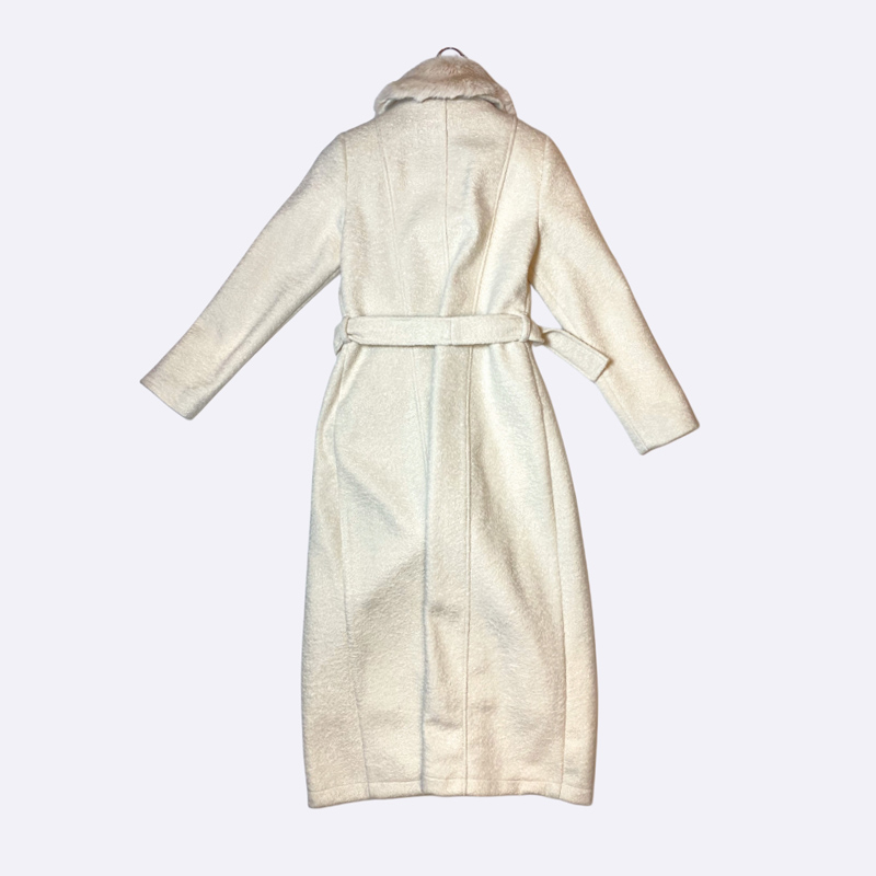 مانطو شتوي نسائي طويل من قماش الجوخ (الكشمير/الصوف) باللون الأبيض العاجي، يتميز بياقة من الفرو الفاتح وحزام عريض للخصر وأزرار بنية داكنة