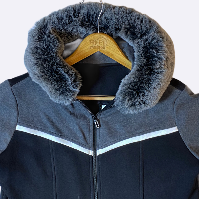 Women's Long Fleece Coat with Fur Hood and Reflective Details