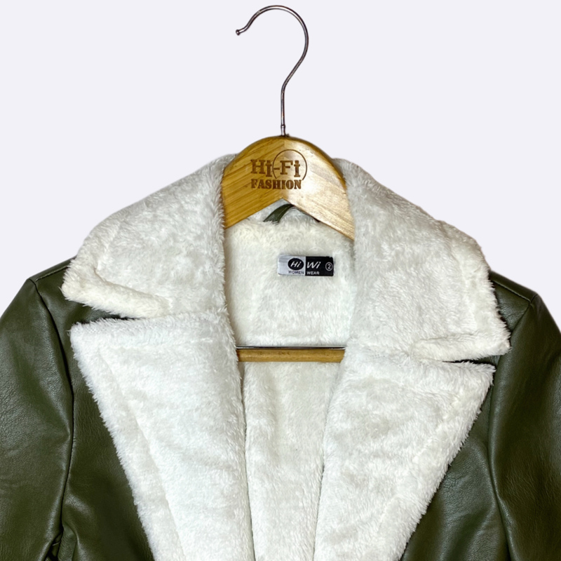 Women's Long Faux Leather Coat with Faux Fur Lining and Trim