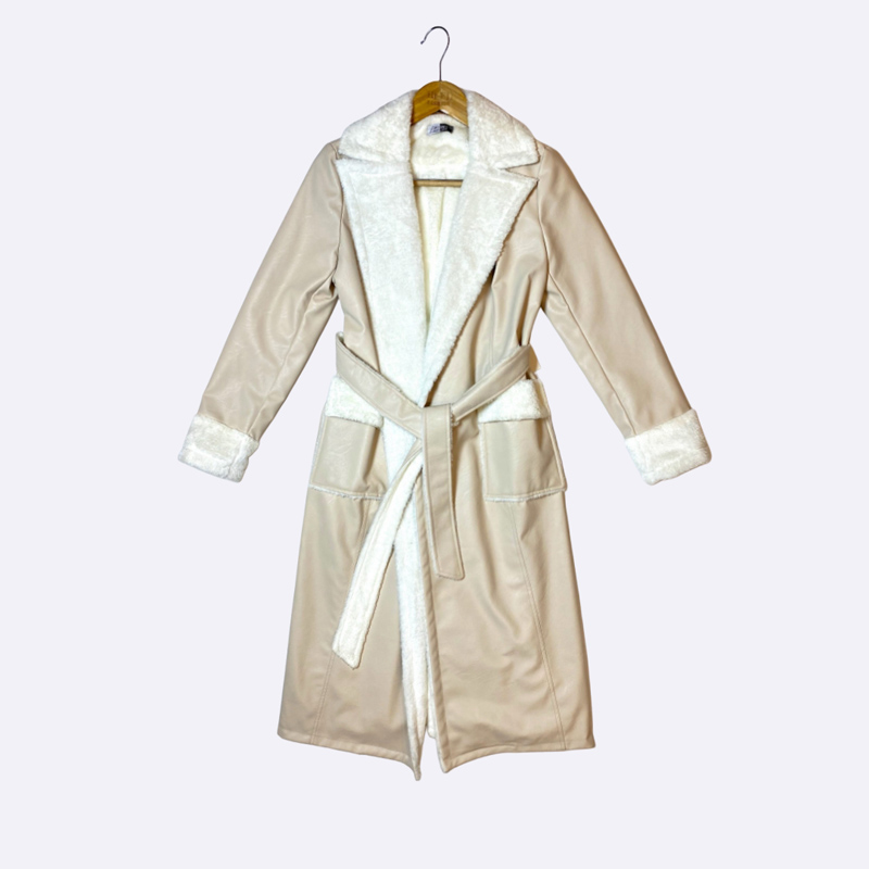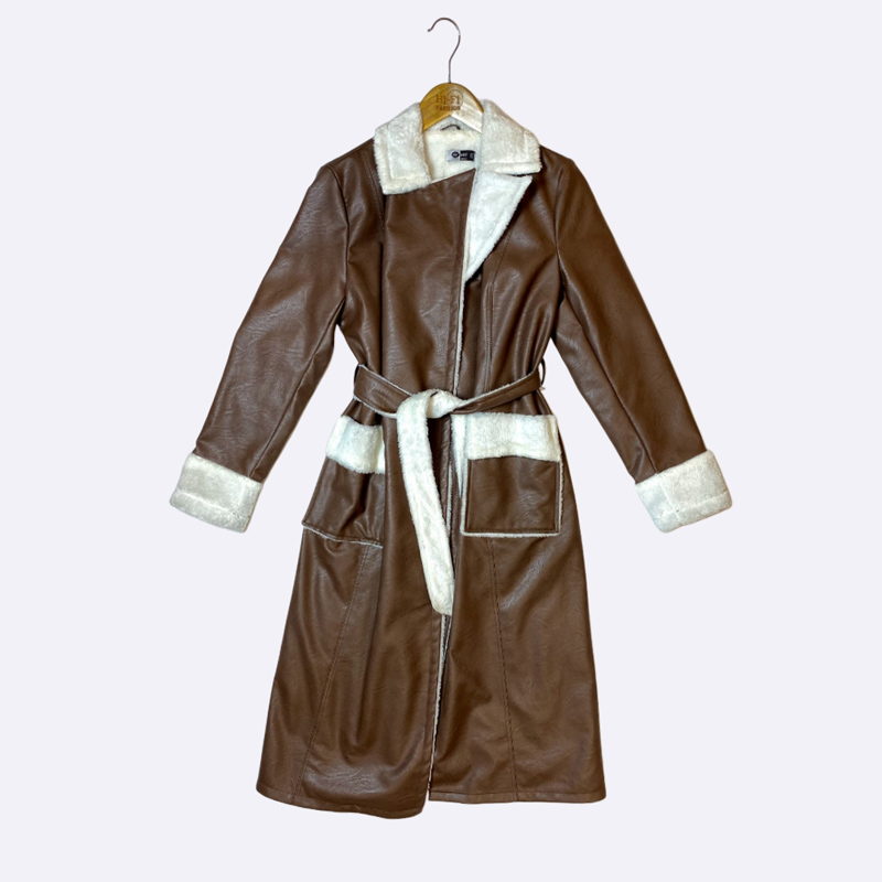 مانطو شتوي نسائي طويل مصنوع من الجلد الصناعي، يتميز ببطانة وكسوة خارجية عند الياقة والأساور من الفرو الدافئ، ومزود بحزام عريض للخصر.