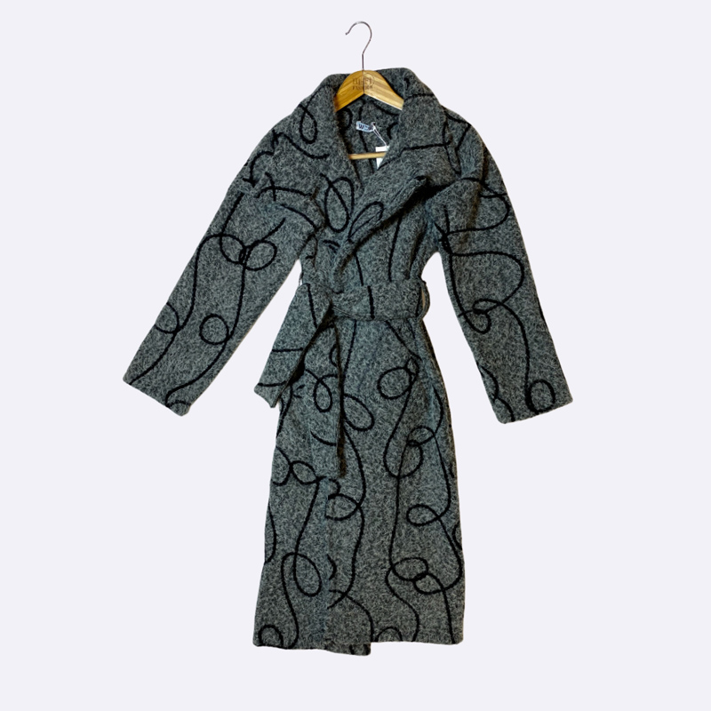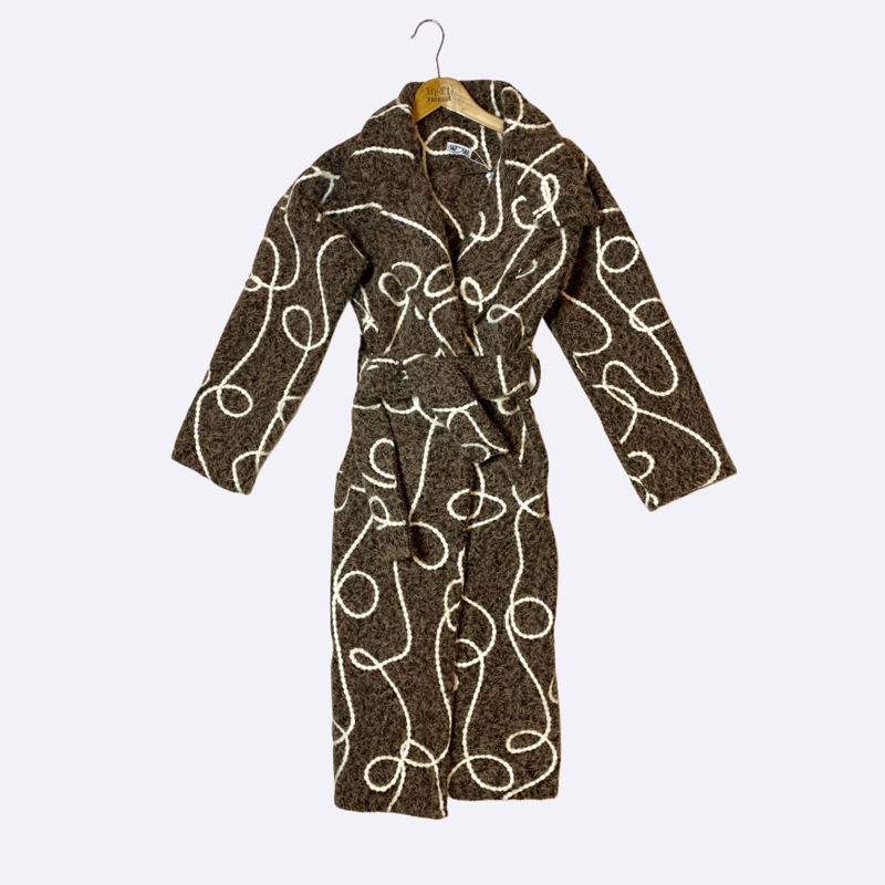 مانطو شتوي نسائي طويل وكلاسيكي، مصنوع من قماش جوخ أو صوف محاك بنقشة حبال متداخلة، يتميز بياقة عريضة وحزام قماش لربط الخصر.