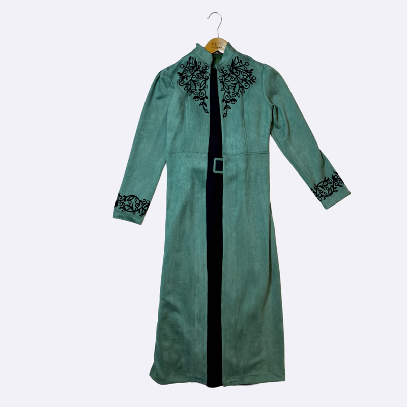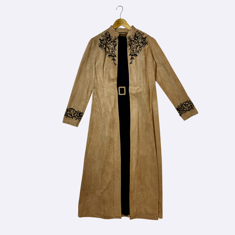 طقم نسائي طويل من قطعتين (مانطو مفتوح داخله قطعة)، المانطو الخارجي من الشامواه الصناعي بياقة مرتفعة وتطريز على الصدر والأكمام وحزام ب buckle.