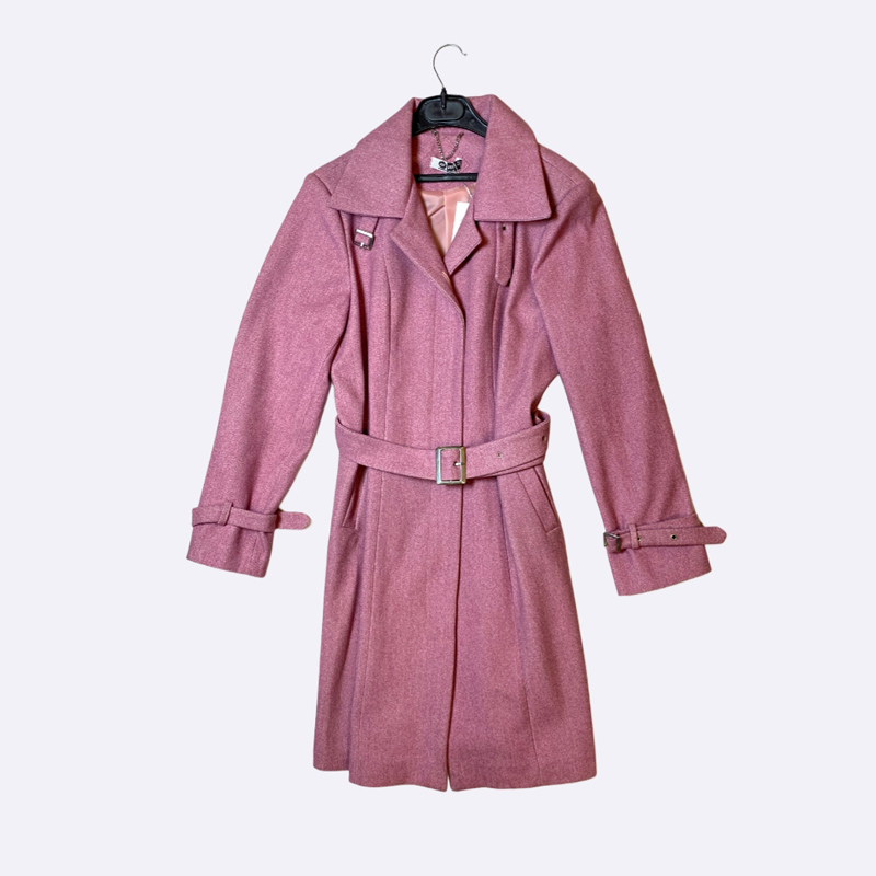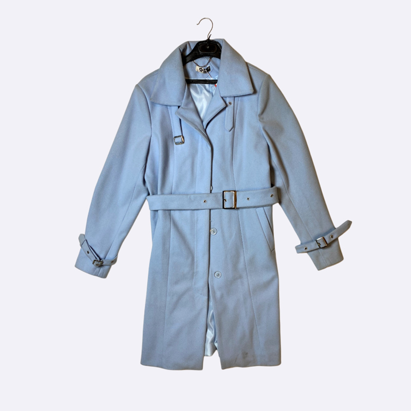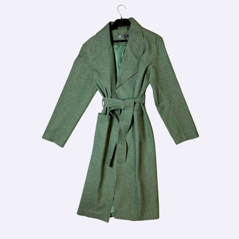 معطف شتوي نسائي متوسط الطول من قماش دافئ، بتصميم مستوحى من معطف الترنش، يتميز بياقة عريضة وحزام للخصر بأبزيم معدني، وتفاصيل إبزيم عند الأساور والياقة.