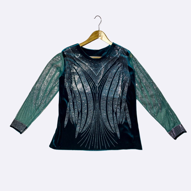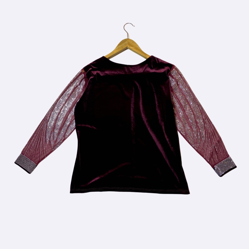توب سهرة أنيق بتصميم مخملي مع أكمام شفافة وتفاصيل لامعة فخمة، يمنح إطلالة راقية ومثالية للمناسبات المسائية والاحتفالات.
