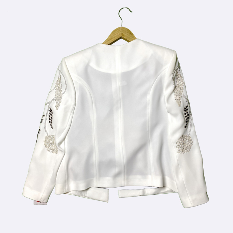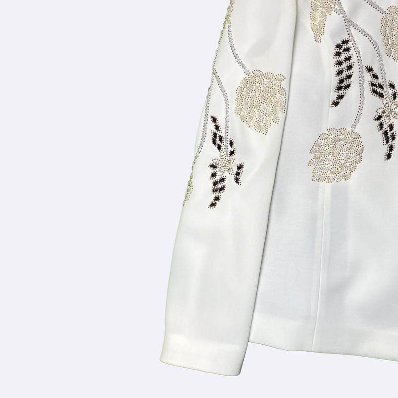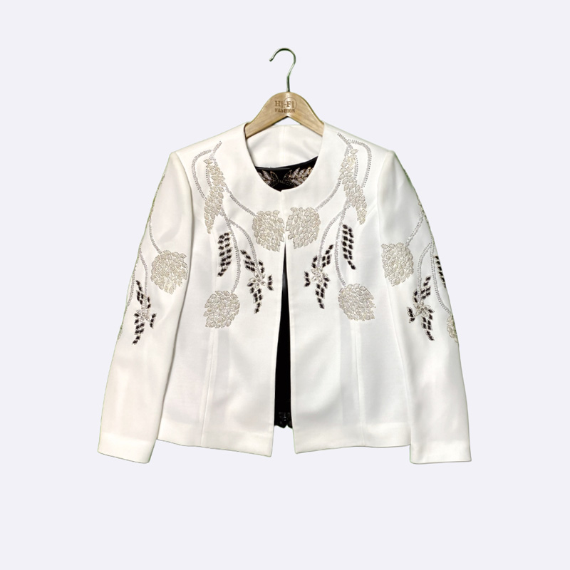 طقم سهرة راقٍ يتكون من جاكيت مزخرف بتطريزات فاخرة وتصميم كلاسيكي، مع تنورة طويلة تمنح إطلالة أنثوية مميزة للمناسبات الرسمية والاحتفالات.