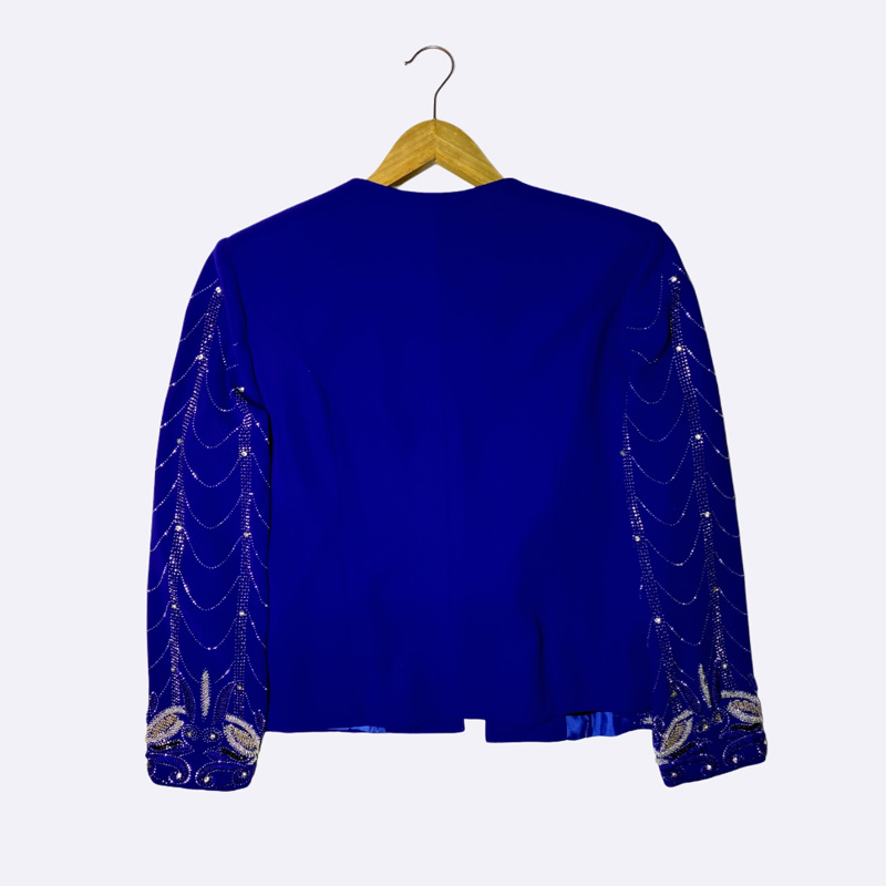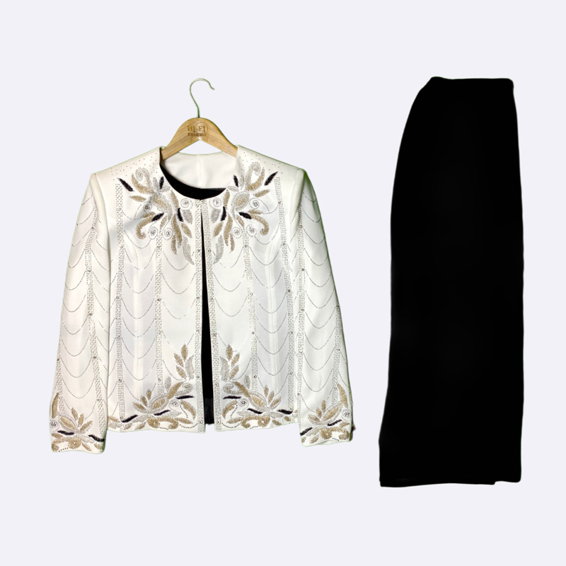 طقم أنيق مكوّن من جاكيت مزخرف بتطريزات لامعة بتصميم متدرج، مع تنورة طويلة كلاسيكية تناسب الإطلالات الرسمية والمناسبات الراقية.