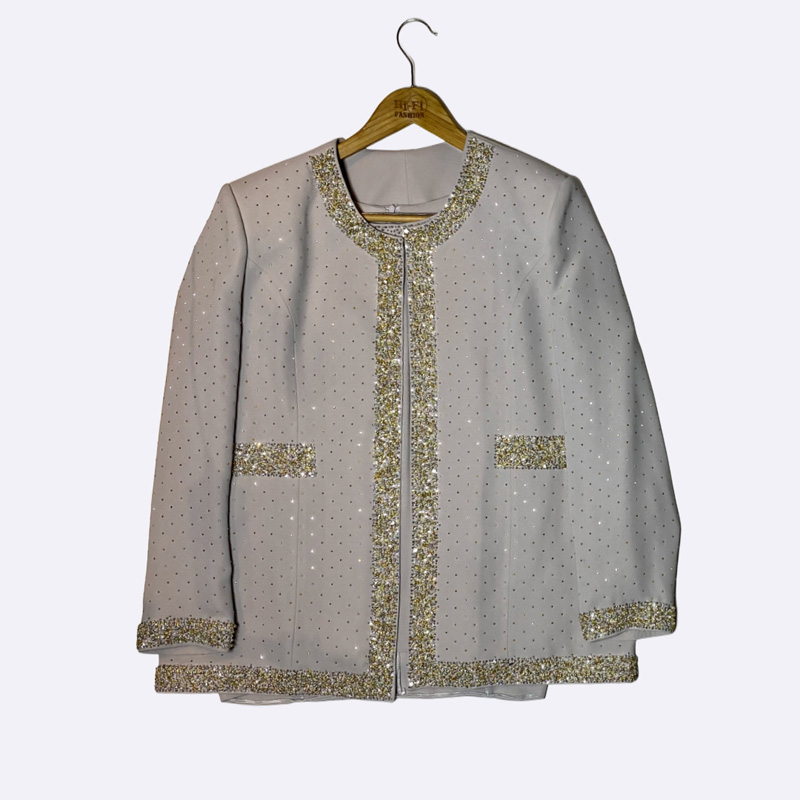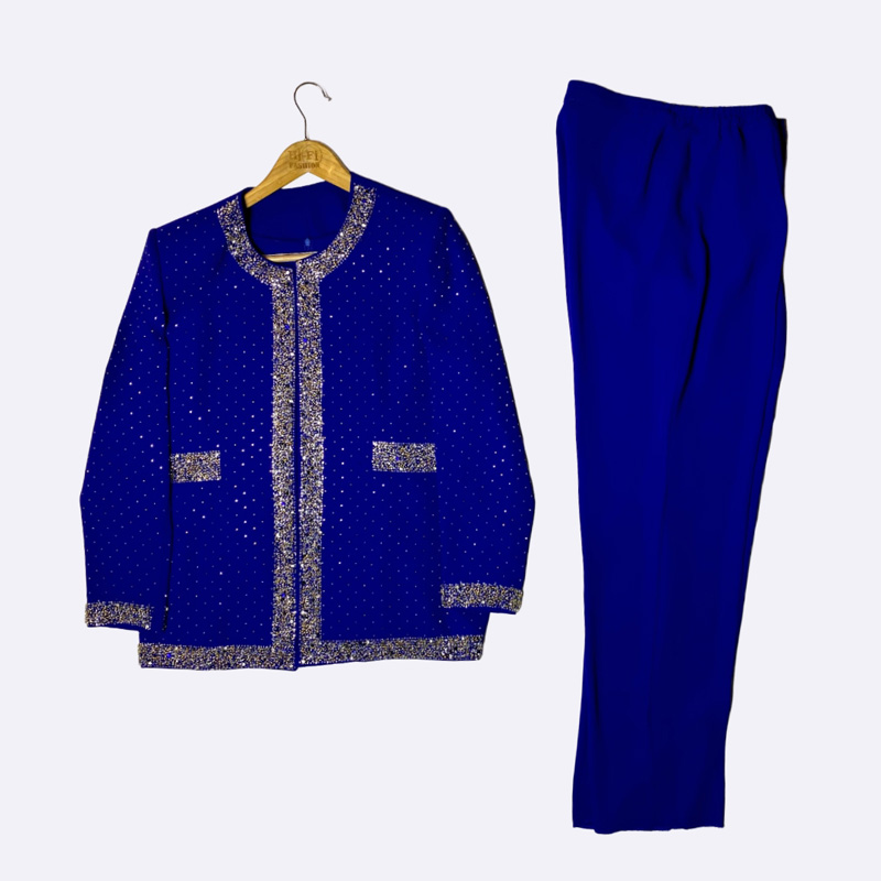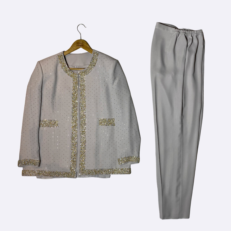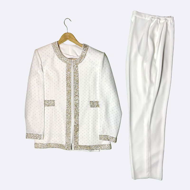 طقم رسمي أنيق يضم جاكيت بتصميم كلاسيكي مزين بتفاصيل لامعة على الأطراف والجيوب، مع بنطال مستقيم يمنح إطلالة راقية ومثالية للمناسبات الرسمية والزيارات الراقية.