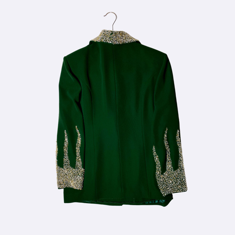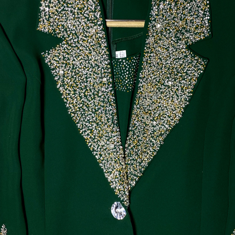 طقم رسمي أنيق يتضمن بليزر مزخرف بتفاصيل لامعة على الياقة والأكمام، مع بنطال مستقيم يمنح إطلالة راقية ومثالية للمناسبات الرسمية والزيارات الراقية.