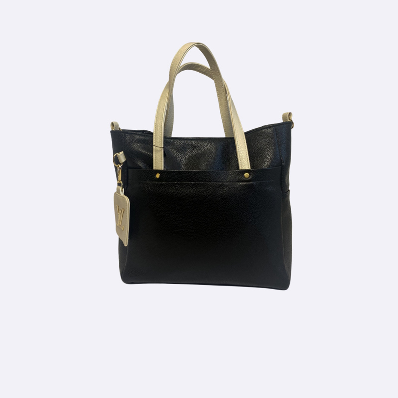 حقيبة يد كبيرة (توت) من الجلد المحبب، ذات مقابض علوية متباينة مع تعليقة شعار مميزة.
