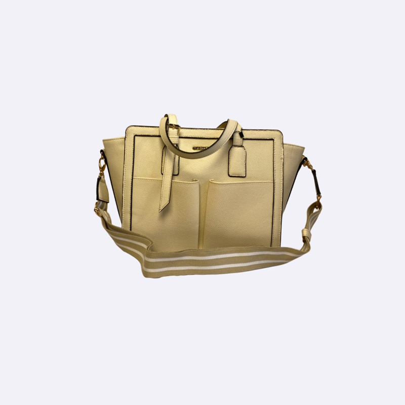 حقيبة يد نسائية ذات هيكل منظم وتصميم عملي، مزودة بجيوب أمامية خارجية وحزام كتف قماشي عريض ومخطط.
