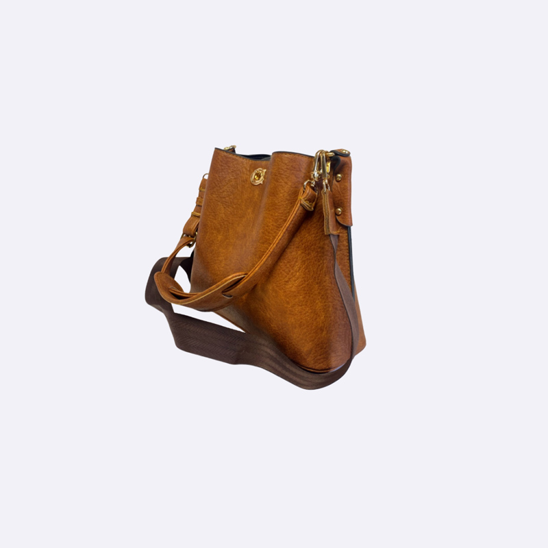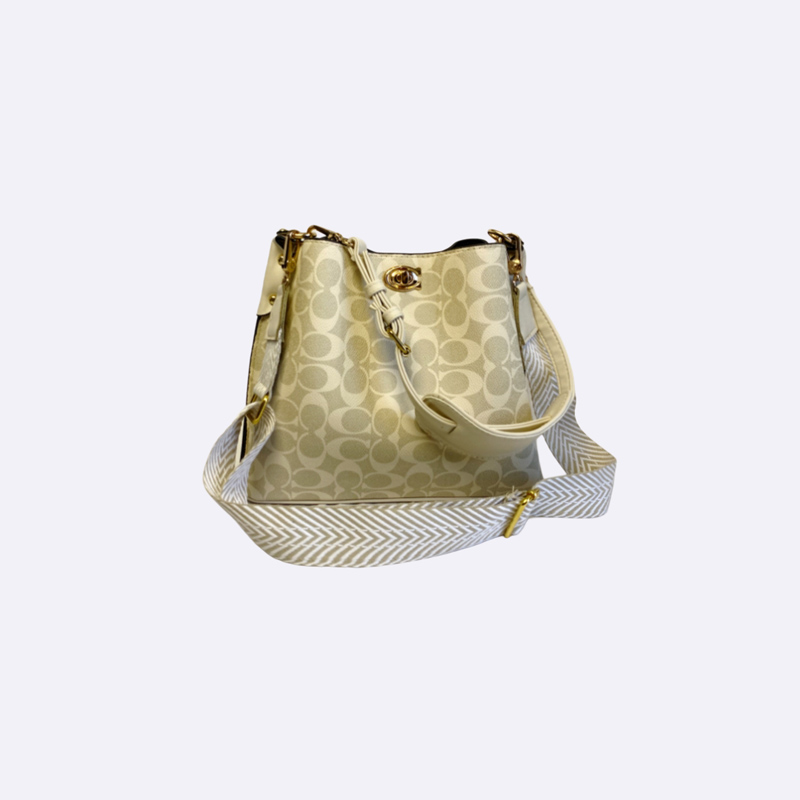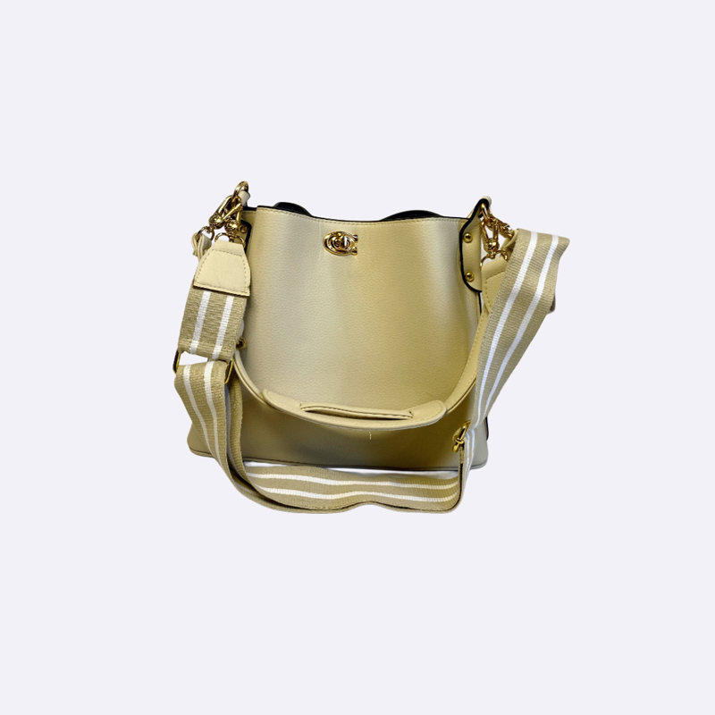 حقيبة نسائية بتصميم دلو صغيرة، ذات نسيج محبب ومزودة بحزام كتف قماشي عريض وحزام رفيع إضافي.