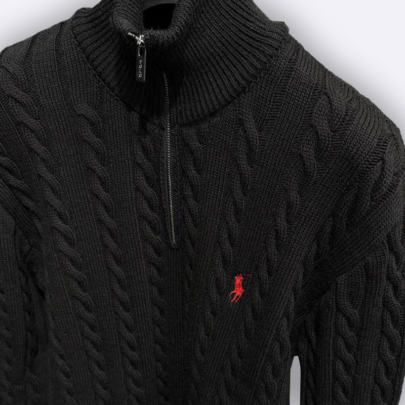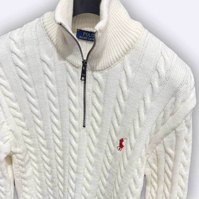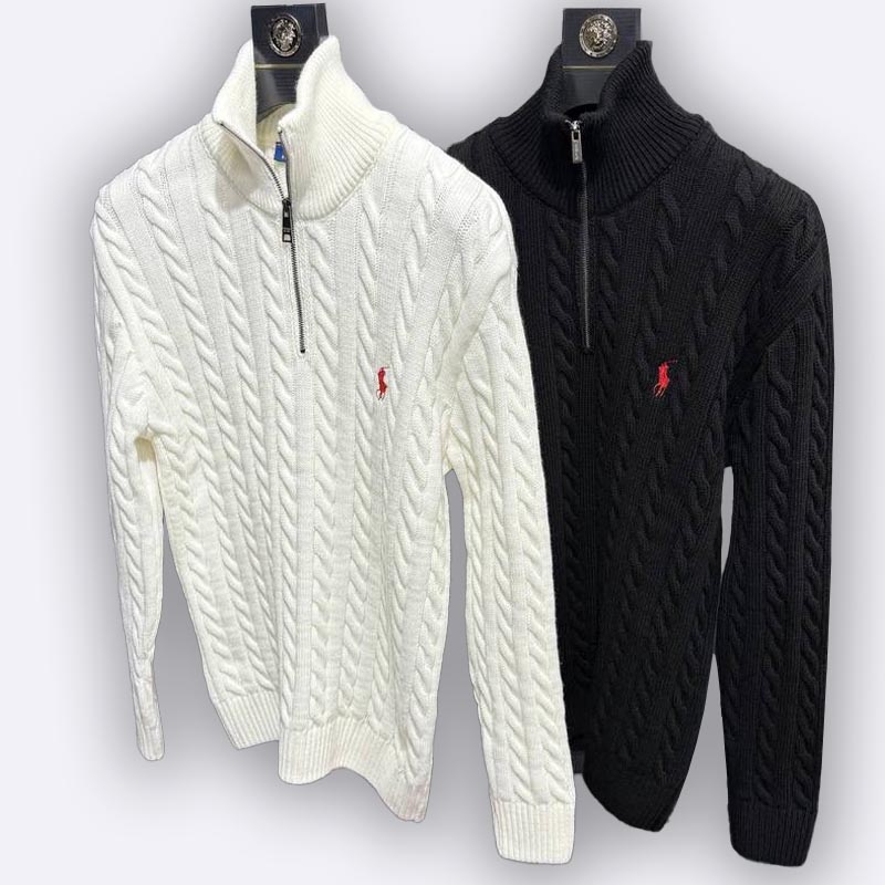كنزة صوفية عالية الرقبة بتصميم محبوك بنقشة الكابل الكلاسيكية، مزودة بسحاب ربعي عند الرقبة، وتتميز بشعار الماركة المطرز على الصدر، وهي مناسبة للارتداء الأنيق في الطقس البارد.