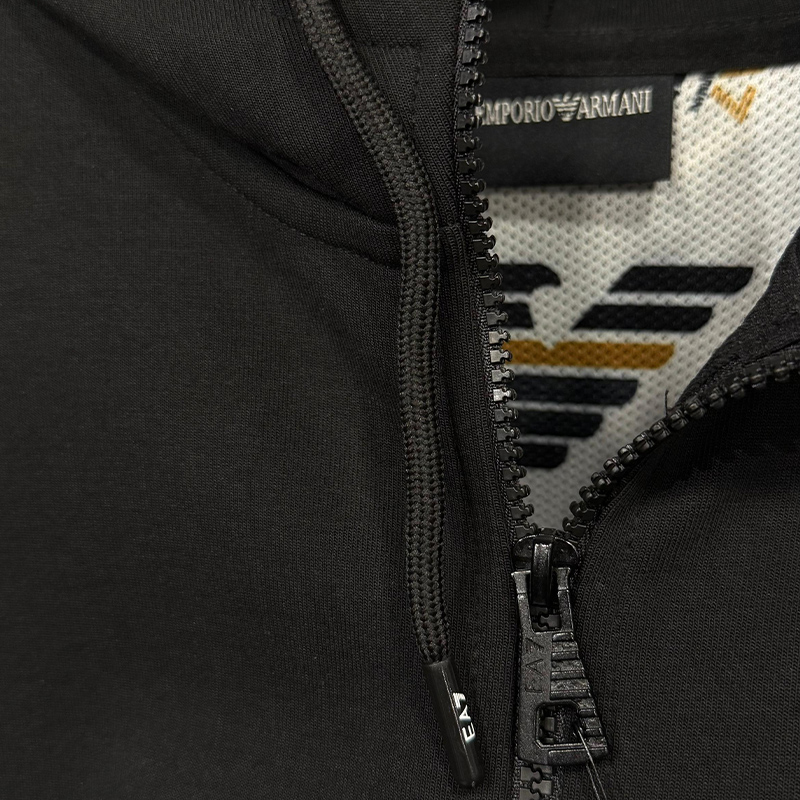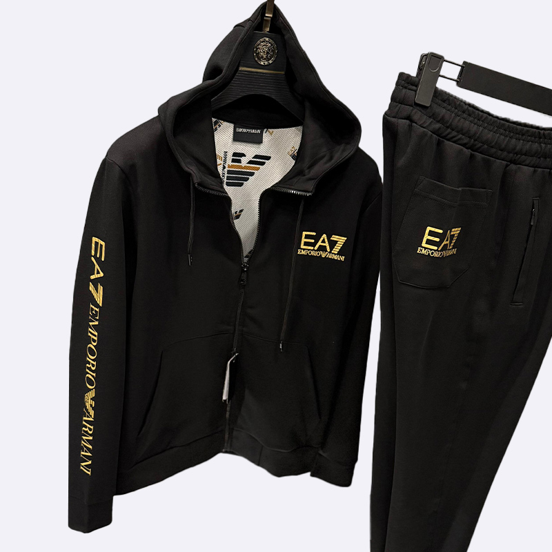 طقم رياضي فاخر مكون من جاكيت مزود بسحاب كامل وقلنسوة وسروال مريح، يتميز بشعار العلامة التجارية (EA7 Emporio Armani) المطبوع على الصدر وعلى طول الأكمام والساقين، ومناسب للارتداء الرياضي واليومي العصري.