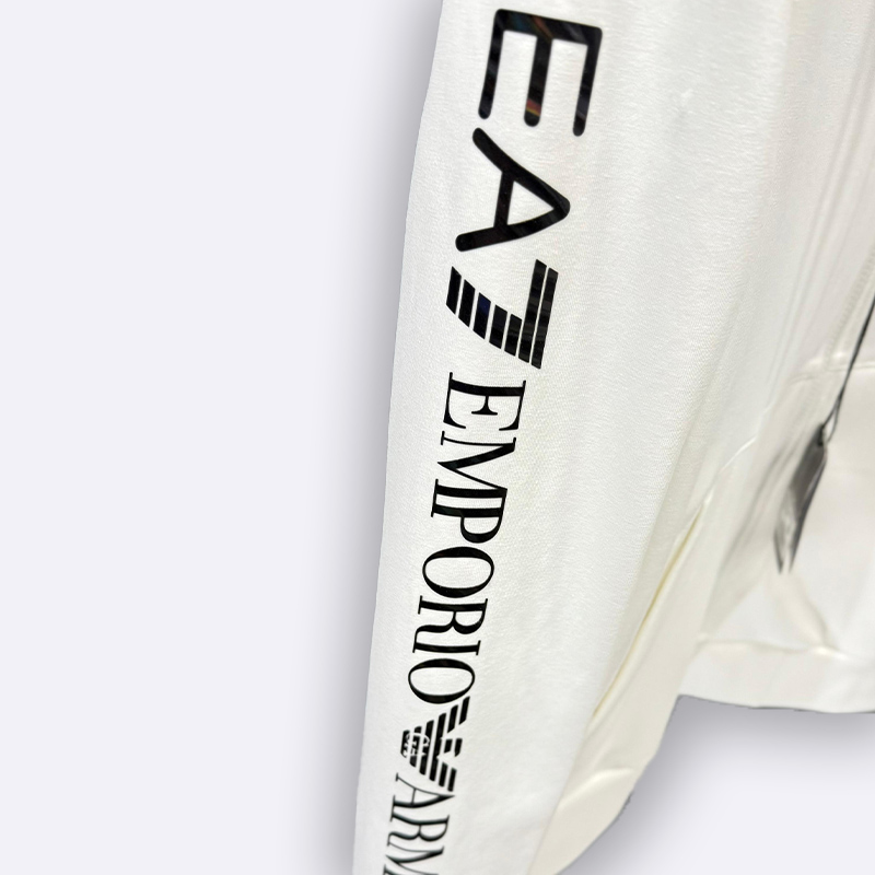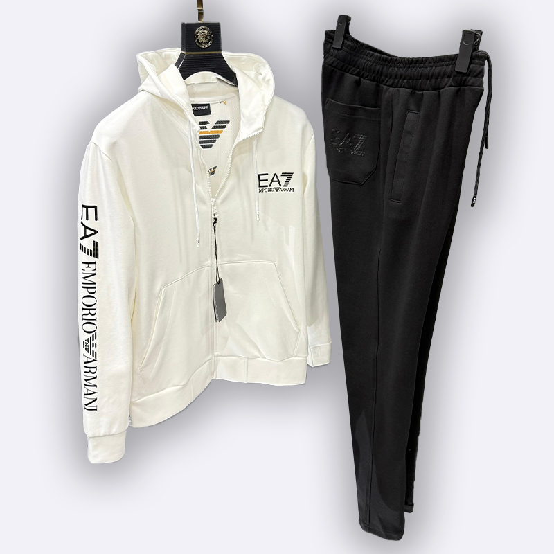 طقم رياضي فاخر مكون من جاكيت مزود بسحاب كامل وقلنسوة وسروال مريح، يتميز بشعار العلامة التجارية (EA7 Emporio Armani) المطبوع على الصدر وعلى طول الأكمام والساقين، ومناسب للارتداء الرياضي واليومي العصري.