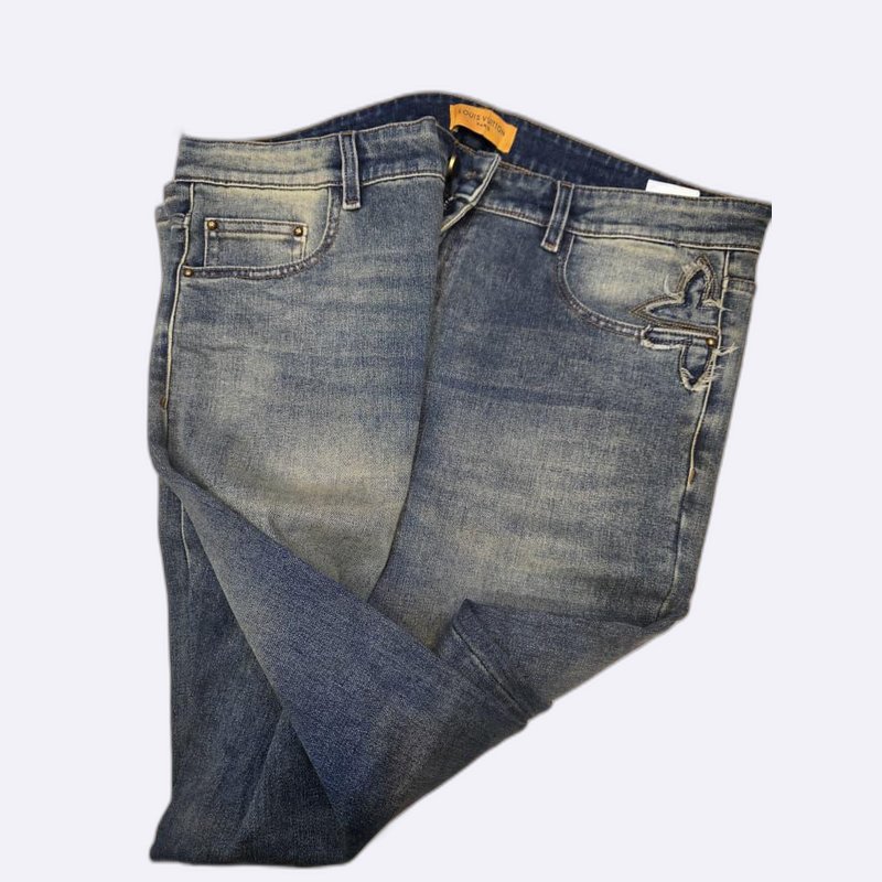 بنطلون جينز بتصميم فني يجمع بين شعار LV وتطريز الفراشة المميز.
